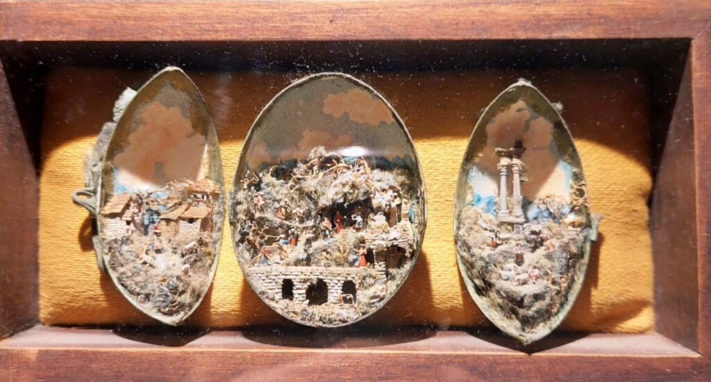 Dapprima ci sono i gruppi, conservati negli scarabattoli* originali, relativi alle tre scene fondamentali della Natività, dell’Annuncio ai Pastori e dell’Osteria. Ma vi sono state inserite, in quantità, le minuterie del presepe napoletano, minuscoli oggetti che rendono veristica la scena.