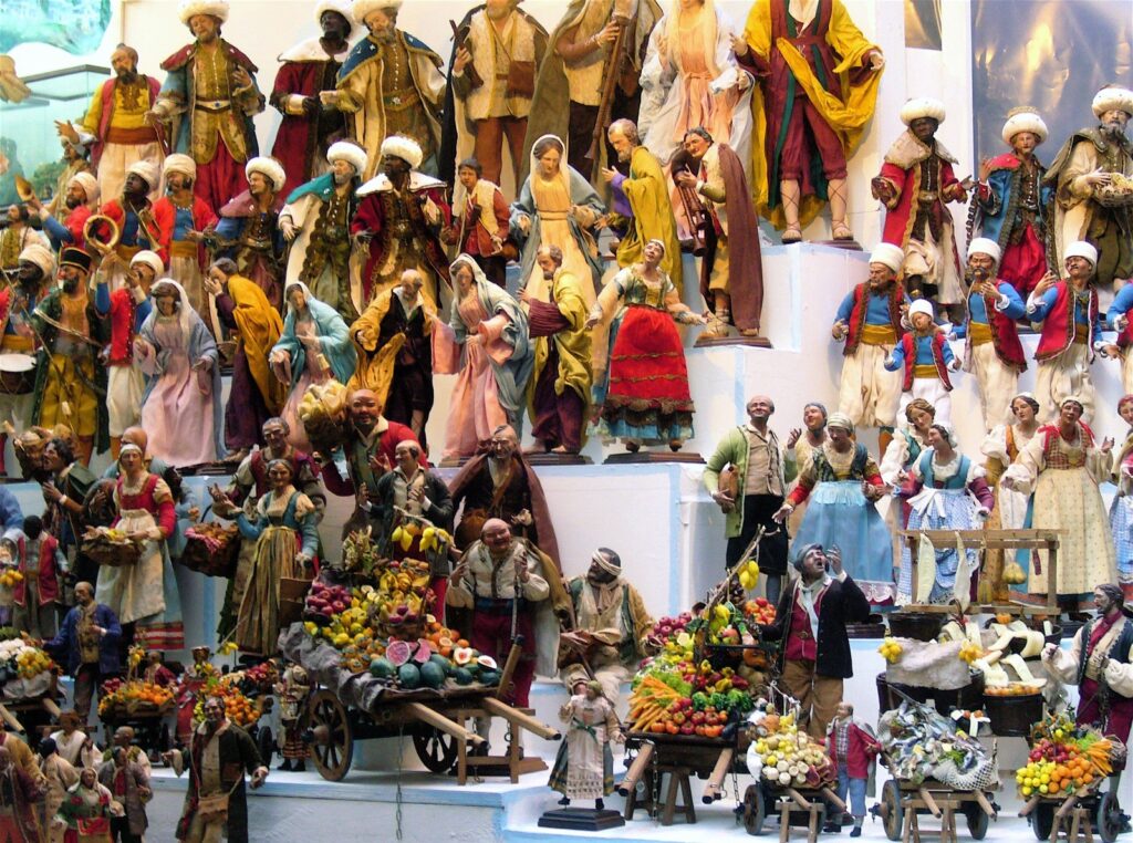 *scarabattoli: mobiletti, del tipo stipo o teca, in legno e cristalli, che contengono piccole statue o gruppi scultorei, come i presepi, appunto.