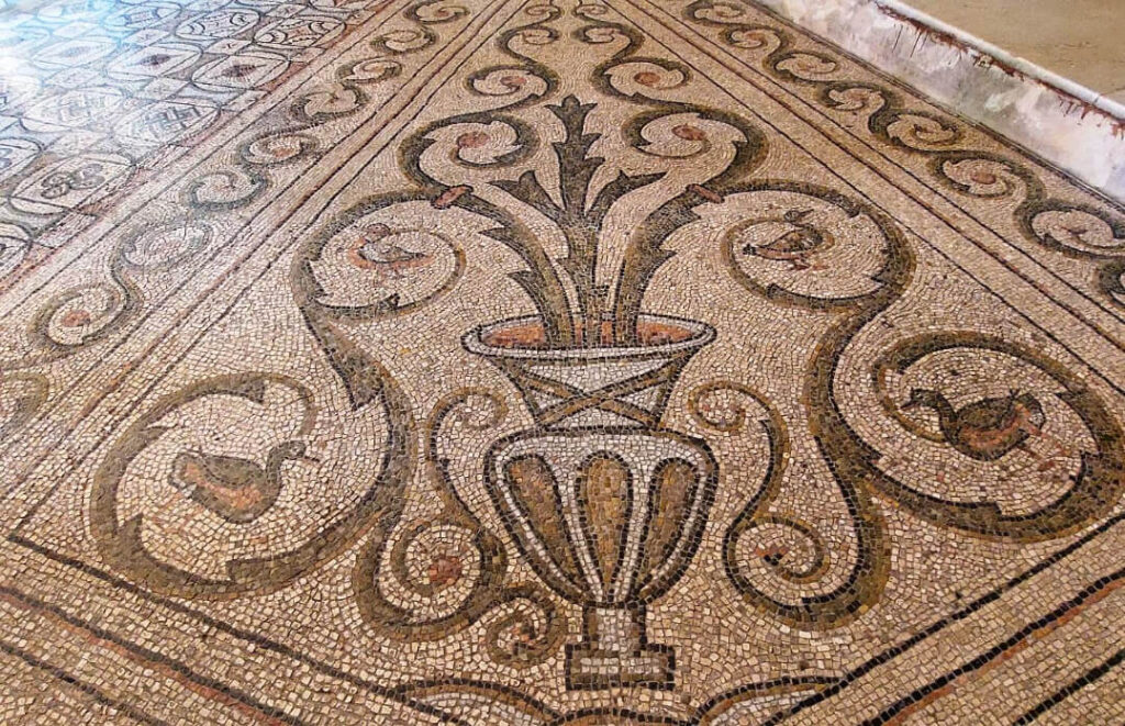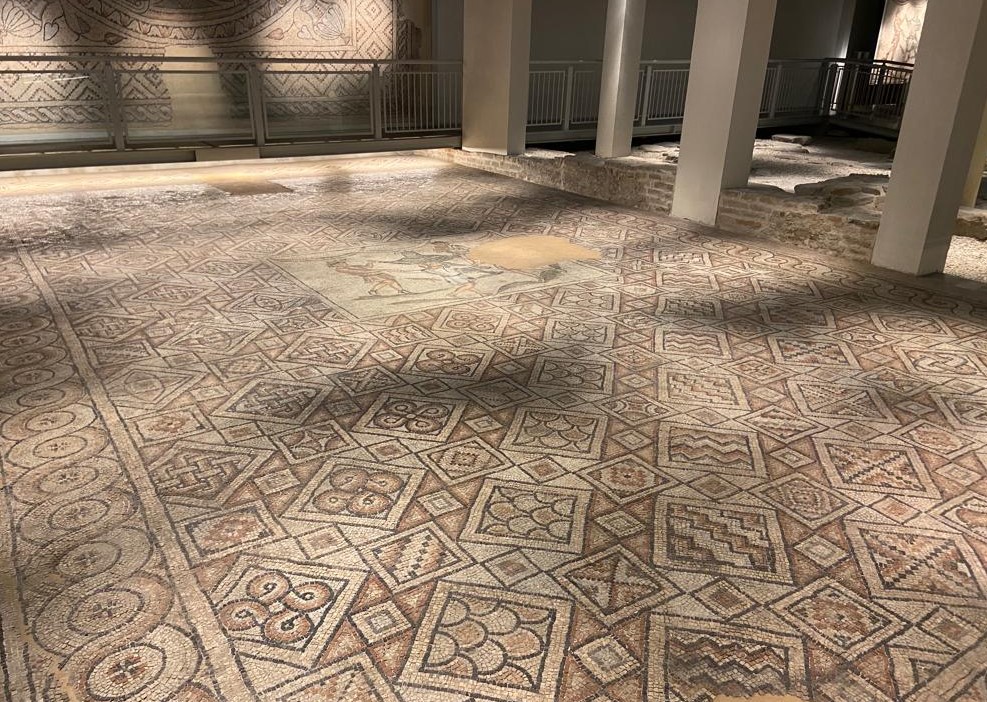 Situata tre metri sotto il livello stradale, la sala conserva più di 400 metri quadrati di mosaici pavimentali policromi, con elementi geometrici, floreali e figurativi ritenuti unici.