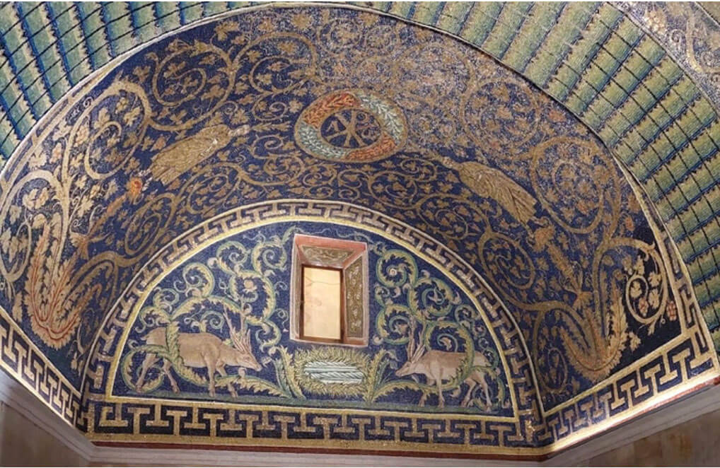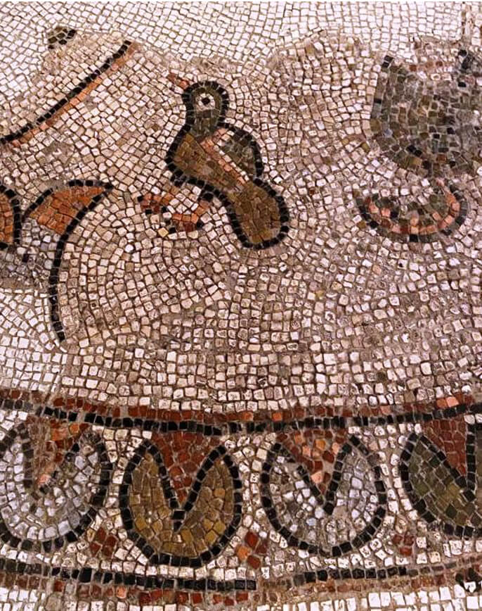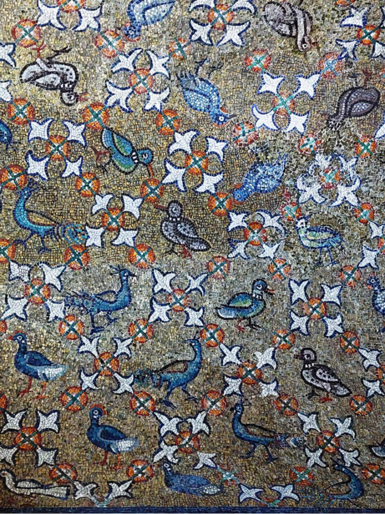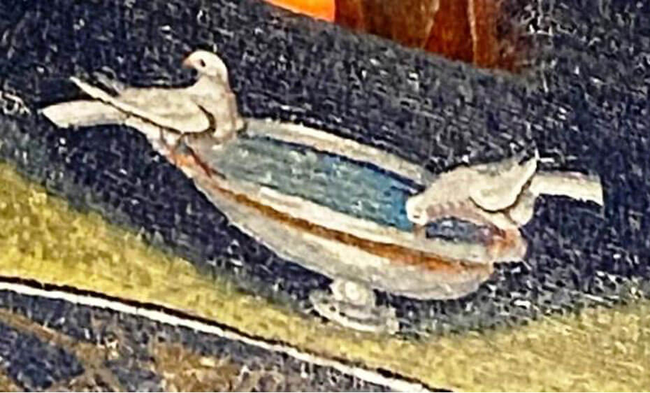 Nel profluvio di mosaici sempre diversi, con ornati vegetali e foglie d’acànto, ci sono alcuni motivi che richiamano la funzione purificatrice dell’acqua: due cervi si abbeverano alla pozza di un paradisiaco giardino; e due colombe bevono a un cantharoi da cui zampilla l’acqua. A simboleggiare la Grazia che attinge alla Fonte Divina.