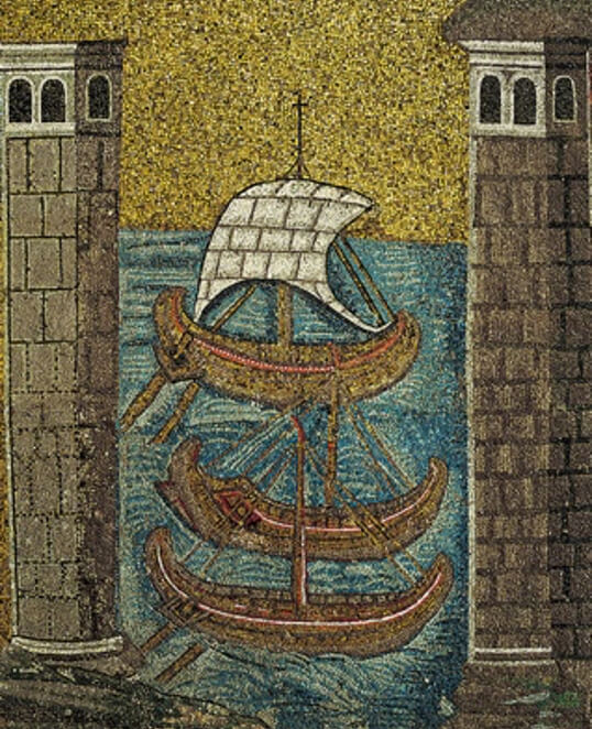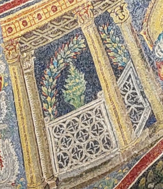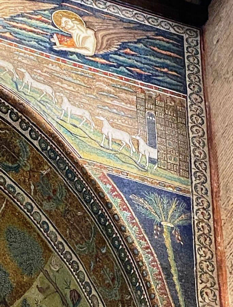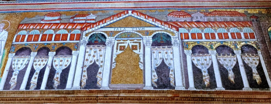 Corro – si fa per dire – a vedere i miei due mosaici preferiti: la Civitas Classis con il suo porto fortificato (che in quel tempo era il più grande di tutto l’Adriatico) e le sue navi a vela; e il Palatium (così è chiamato nell’iscrizione) di Teodorico, con quelle manine aggrappate alle colonne (i bizantini condannarono il re goto alla damnatio memoriae, per cui Teodorico e i suoi dignitari, in piedi sotto le arcate del palazzo, furono abrasi e sostituiti da tendaggi bianchi – la Storia non ha nessuna pietà degli sconfitti).