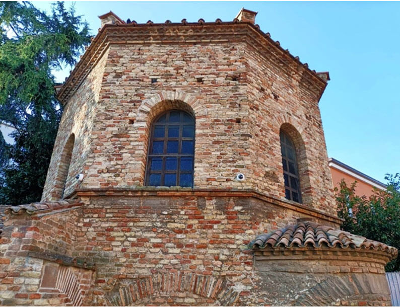 Più basso di due metri rispetto al livello stradale per il fenomeno della subdizione, è un affascinante edificio ottagonale, in mattoni rossi, della fine del V secolo; fatto innalzare da Teodorico quando l’arianesimo era religione ufficiale della corte.