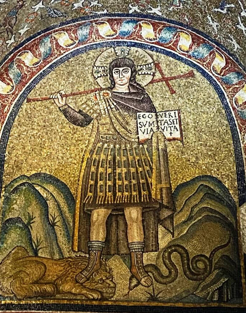 Galla Placidia è la stessa che ieri abbiamo incontrato a San Giovanni Evangelista. Là aveva eretto la basilica per ottemperare a un voto, qui ha fatto costruire un mausoleo per sé, come aveva già fatto Costanza, figlia di Costantino, a Roma. Del resto, lei non era da meno di Costanza, anzi: figlia dell’imperatore Teodosio, sorella dell’imperatore Onorio, imperatrice reggente per conto del figlio Valentiniano III; ce n’era abbastanza per farsene costruire anche tre, di mausolei! Poi, quando morì a Roma nel 450, fu seppellita là.