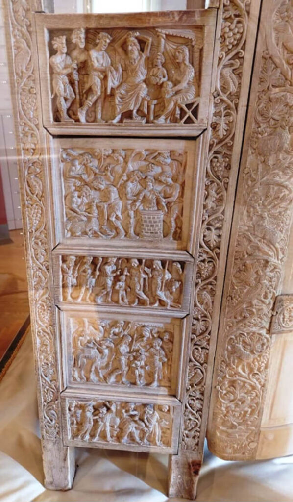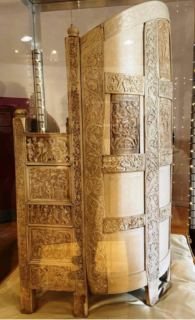 È un’opera preziosissima, in avorio lavorato su tavolette applicate ad una struttura lignea: vi sono intagliate scene dell’Antico Testamento (storie di Giuseppe) e dei Vangeli.