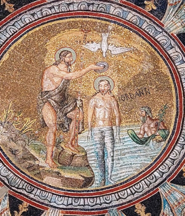 Nel clipeo centrale c’è la scena del Battesimo, dove si vedono – come nel Battistero degli Ariani, ma ricordiamoci che questo è anteriore di 40 anni – Gesù, san Giovanni Battista e la personificazione del fiume Giordano (come vecchio, seminudo e barbuto), che emerge dalle acque tenendo in mano una canna palustre e nell’altra un drappo (con il quale Cristo si asciugherà); il Battista reca in mano una pàtera5, anche se, in origine, doveva poggiare la mano direttamente sulla testa di Cristo, come si usava fare. L’inserimento più tardo della pàtera è testimoniato dal colore più chiaro delle tessere.