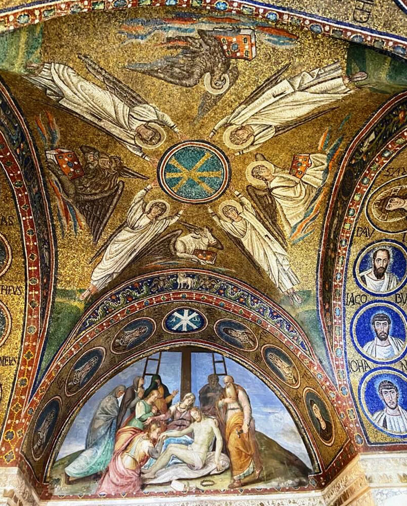 Questo episodio poneva in difficoltà gli artisti: lo risolsero sostituendo la figura di Gesù con una grande croce gemmata dentro un disco a fondo azzurro, assieme a 99 stelle. Al centro della croce c’è il volto del Cristo. In alto, dalle nubi d’oro, sporge la mano di Dio (l’abbiamo vista anche a Napoli, nel battistero di S. Giovanni in Fonte).