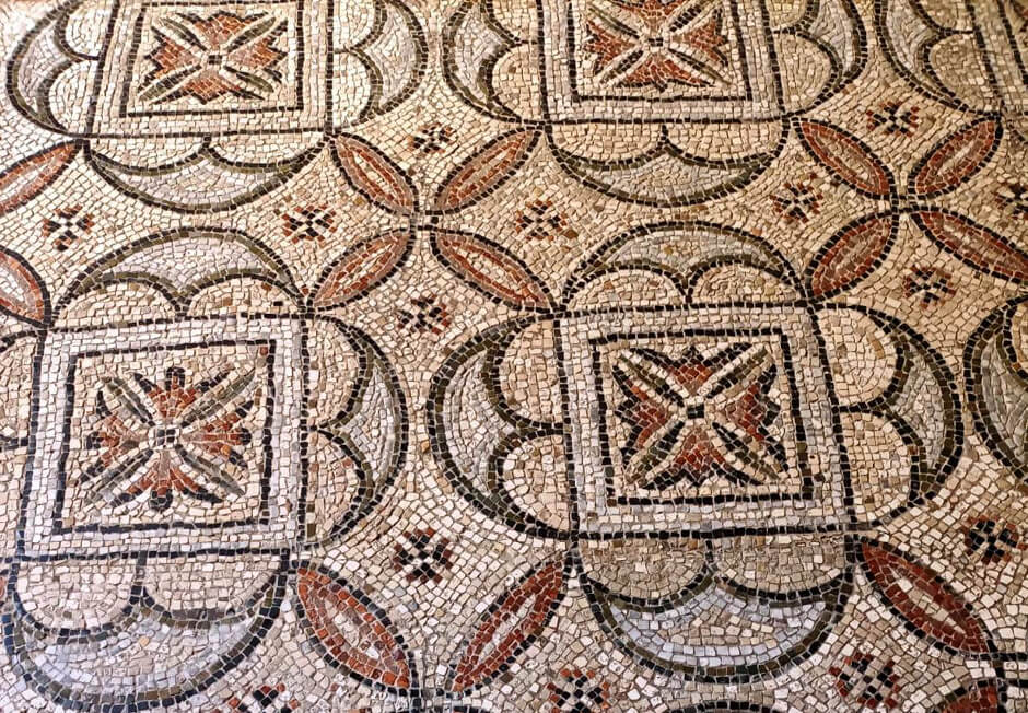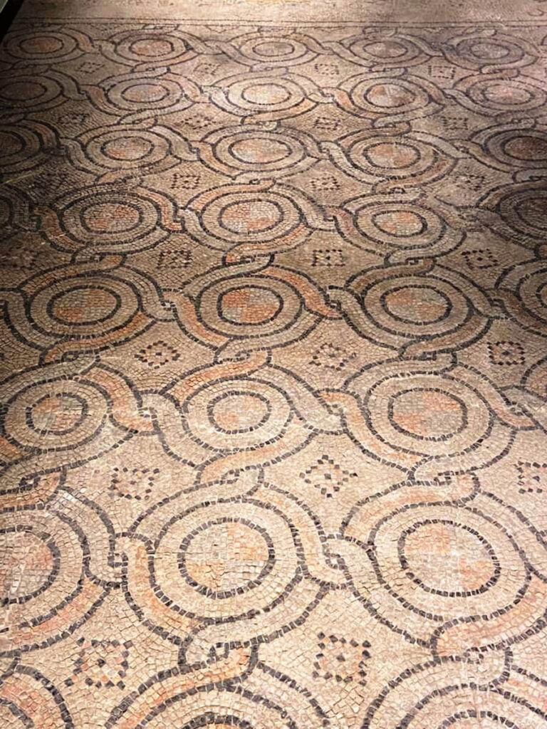 Adesso ci resta il vasto pavimento: stupefacente! In ogni locale un diverso mosaico simula grandi tappeti.