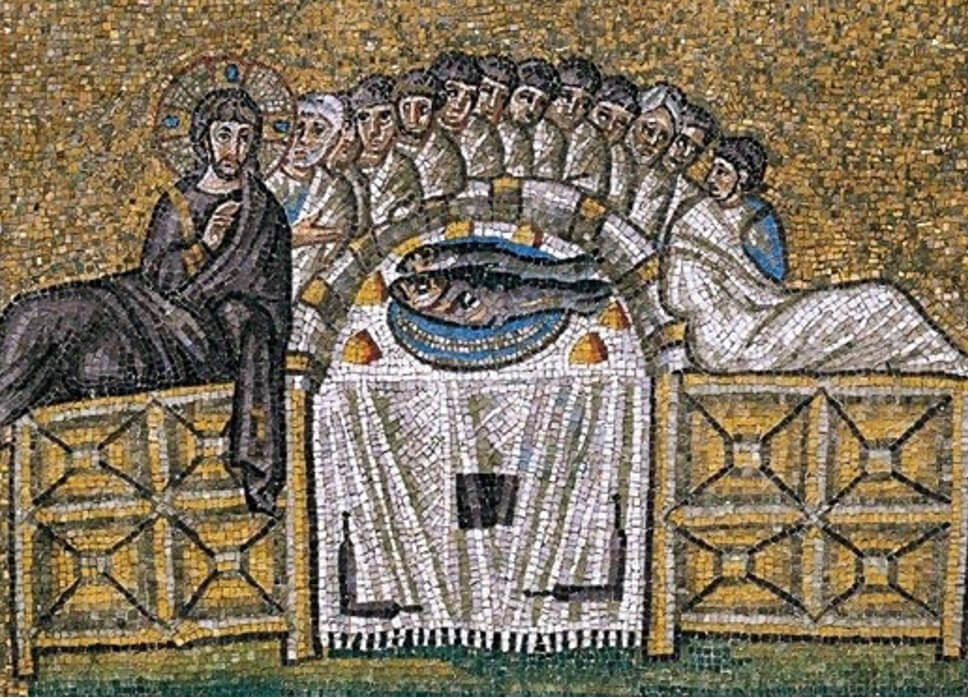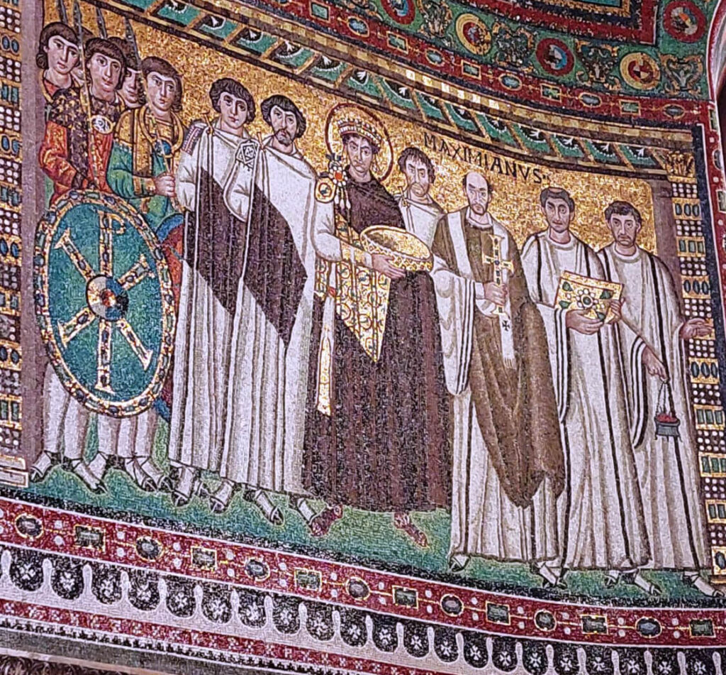 Accanto a Giustiniano c’è un altro dignitario, poi tre clericali: fra essi spicca il vescovo Massimiano, primo a Ravenna a fregiarsi del titolo di arcivescovo, che lo innalzava quasi al rango del papa; poi c’è un diacono che tiene in mano un libro dei Vangeli con la copertina rivestita di gemme, e un altro diacono che regge il turibolo dell’incenso.