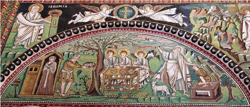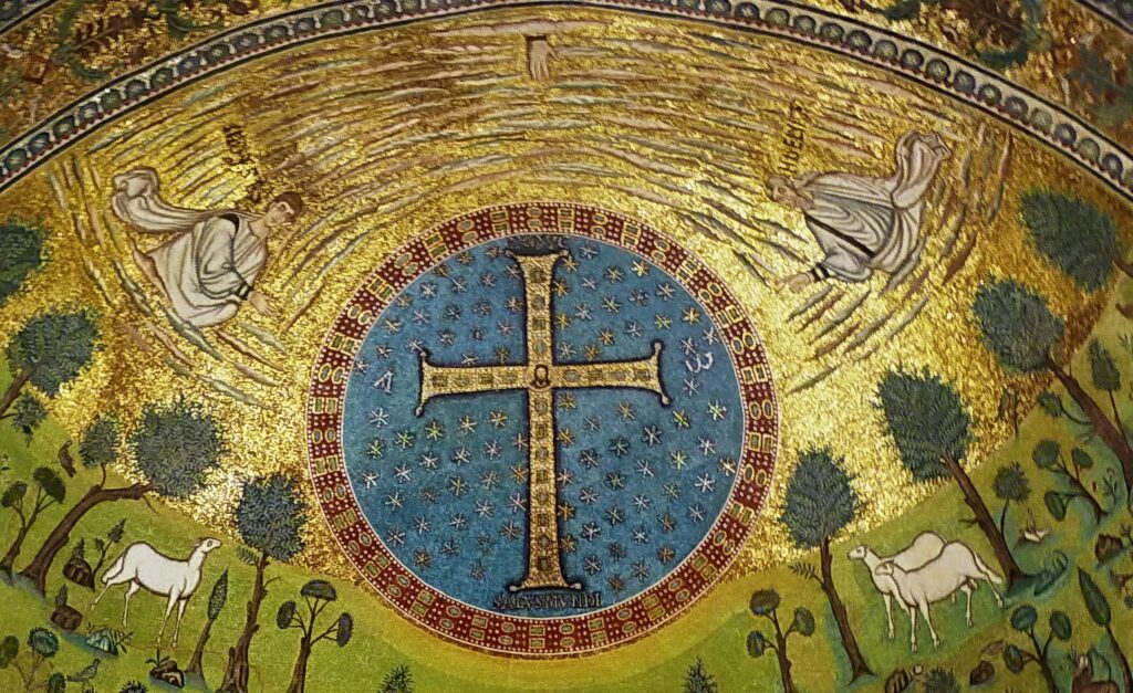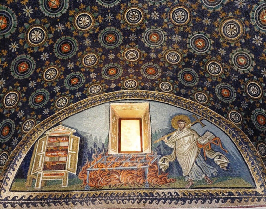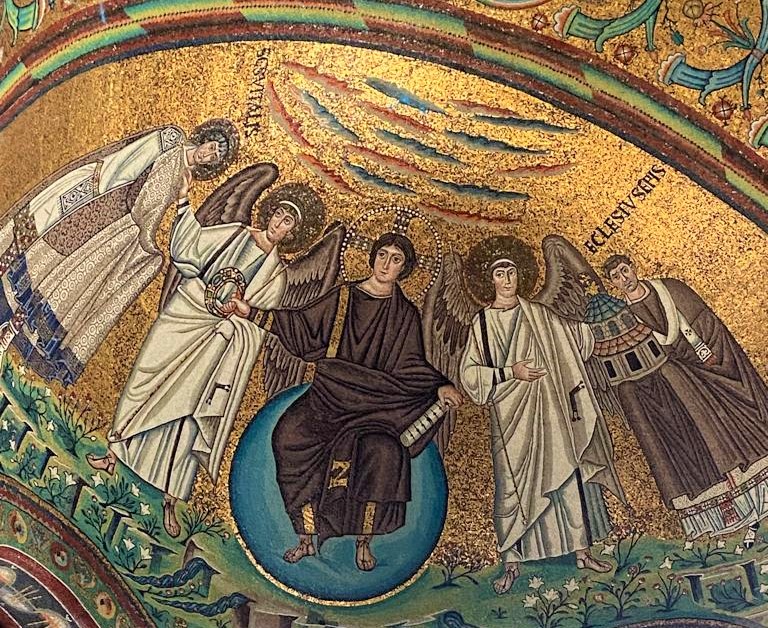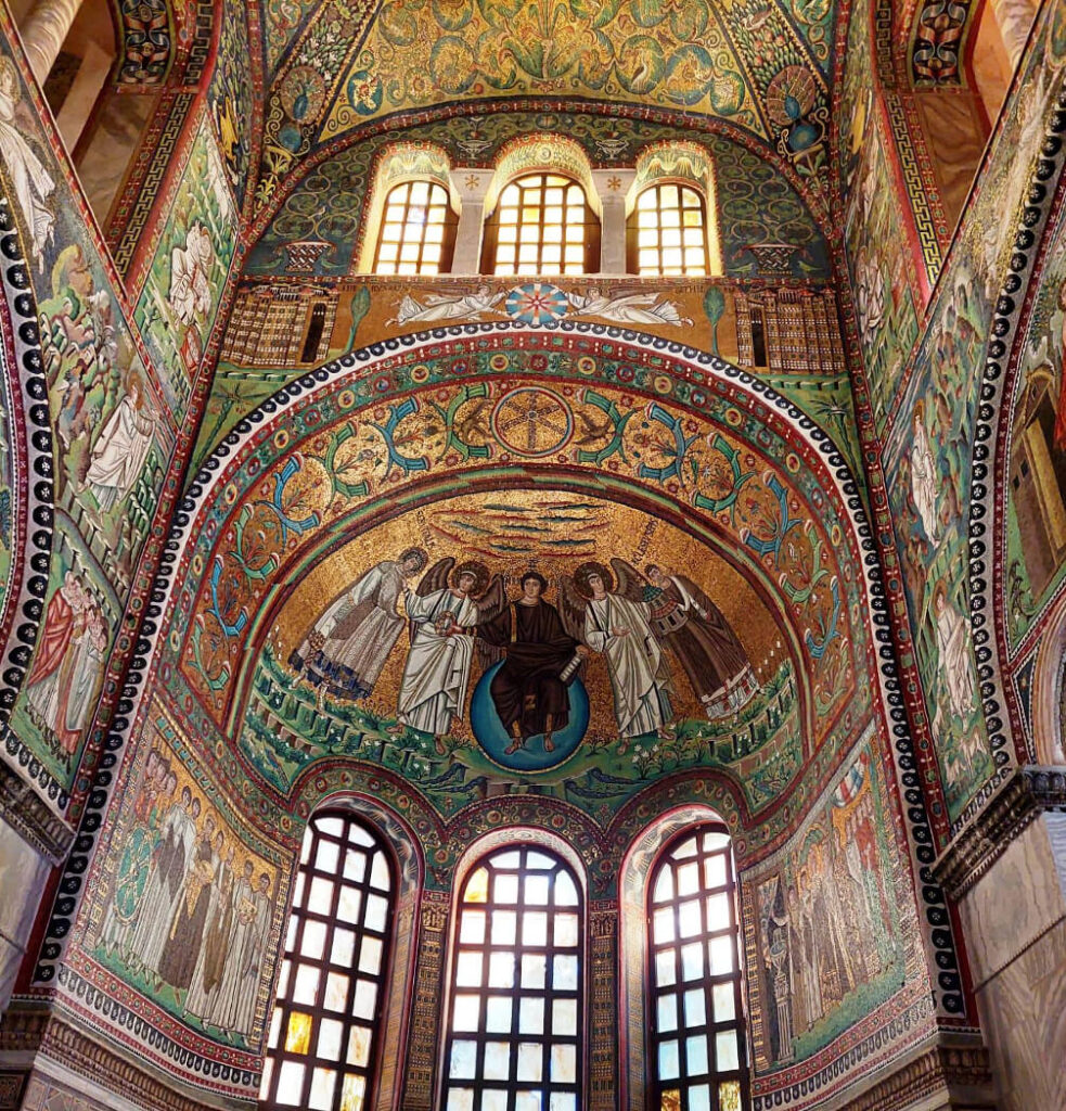 Nella conca absidale, vediamo Gesù, giovane e imberbe, seduto su un trono azzurro, rappresentante l’universo; egli allunga una mano per consegnare a san Vitale, presentato da un angelo, una corona: è il simbolo della vita eterna (ricordiamocelo, visto che le corone le abbiamo già incontrate al Battistero degli Ariani!). San Vitale avanza da sinistra, con le mani ricoperte dalla sua ricchissima clamide.A destra, un altro angelo presenta a Gesù Ecclesio, che era il vescovo di Ravenna all’inizio dei lavori, e che per questo tiene in mano una chiesa in miniatura, come segno di offerta a Dio.