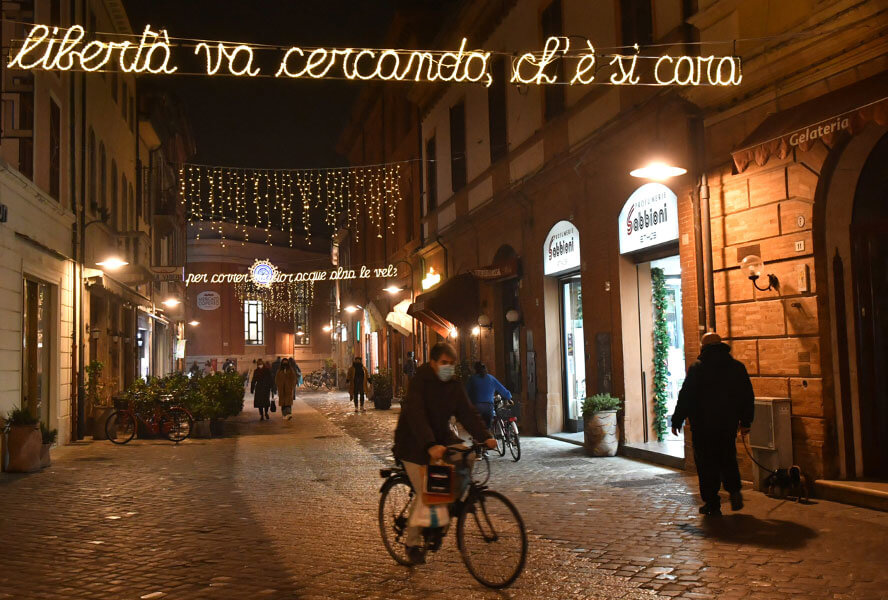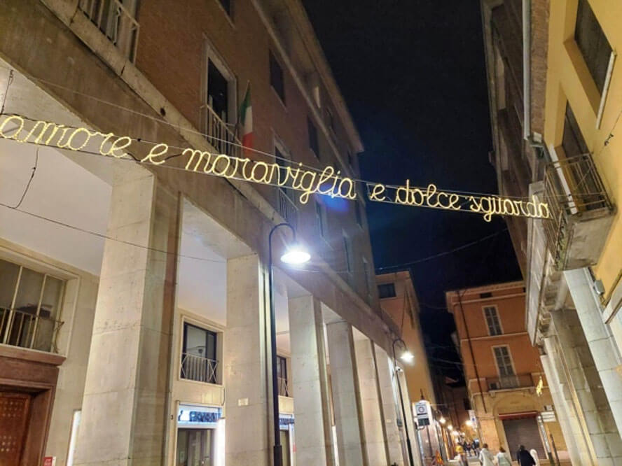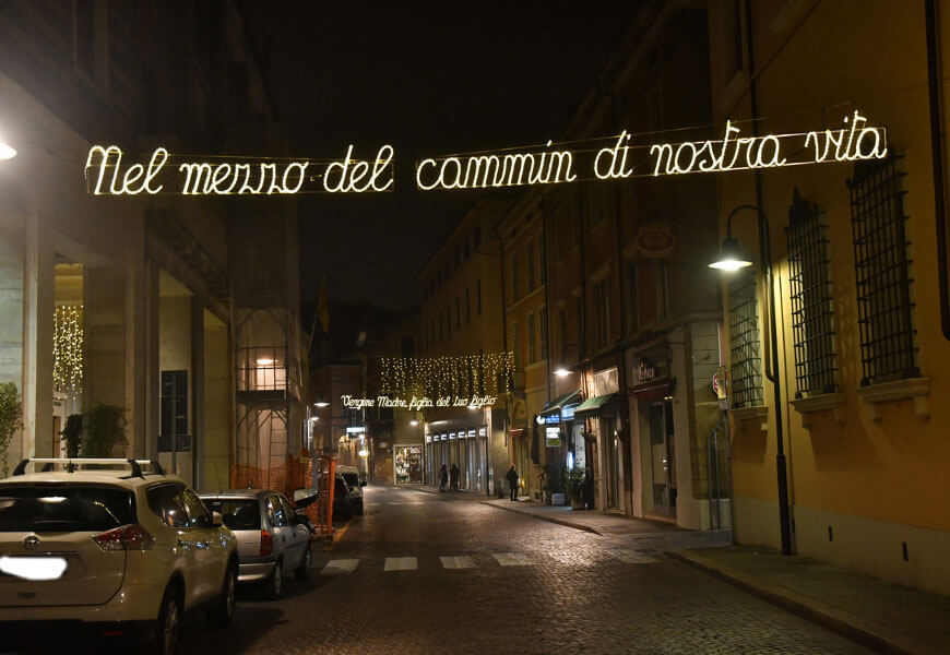 Le vie di Ravenna risplendono di luminarie dantesche: sanno bene qui come rendere omaggio al Poeta! In ogni via tre o quattro luminarie recano un verso del poema. È commovente!