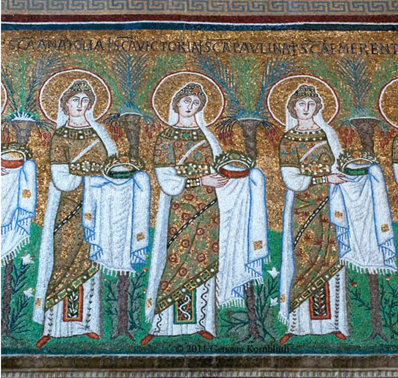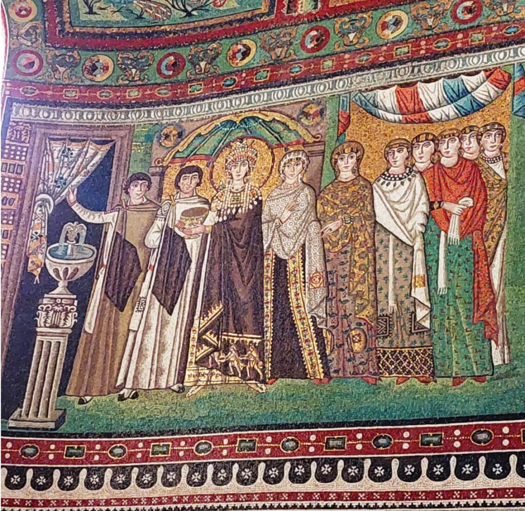 Nel riquadro con l’imperatore, vediamo a sinistra cinque soldati della guardia del corpo –sullo scudo il monogramma di Cristo – quindi due dignitari che indossano la clamide (un mantello lungo fino ai piedi); poi Giustiniano in uno sfarzoso abito da cerimonia con un grande bacile d’oro nelle mani: il diadema, la fibula sulla spalla e persino i calzari sono trapunti di gemme. Il cerchio dorato che gli fa da contorno alla testa (è così anche per Teodora) è un motivo glorificante, già adottato per gli imperatori e che, nel Medioevo, diventerà attributo dei santi (e si chiamerà nimbo e aureola).