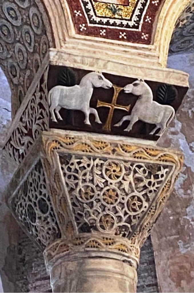 Magnifici pulvini staccano l’arco, quasi sollevandolo e sospingendolo in alto; preziosi capitelli, scolpiti a Bisanzio, sono traforati come fossero trine.