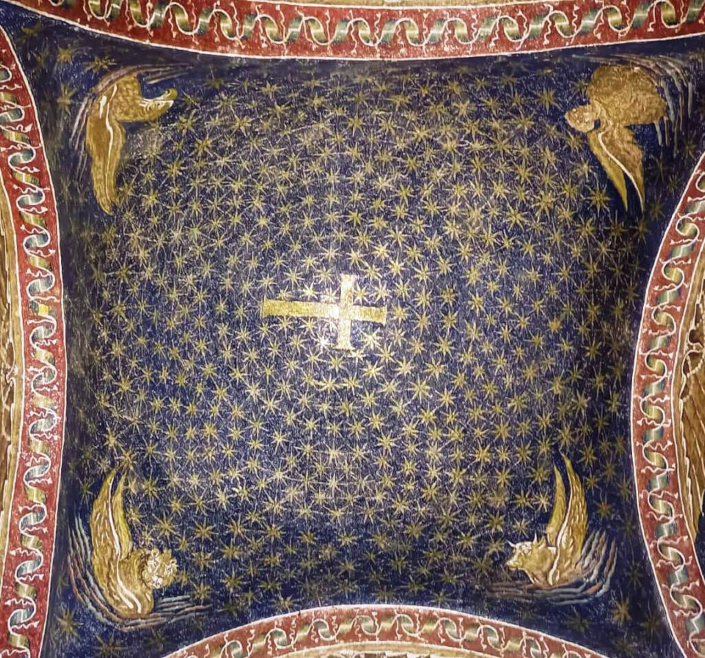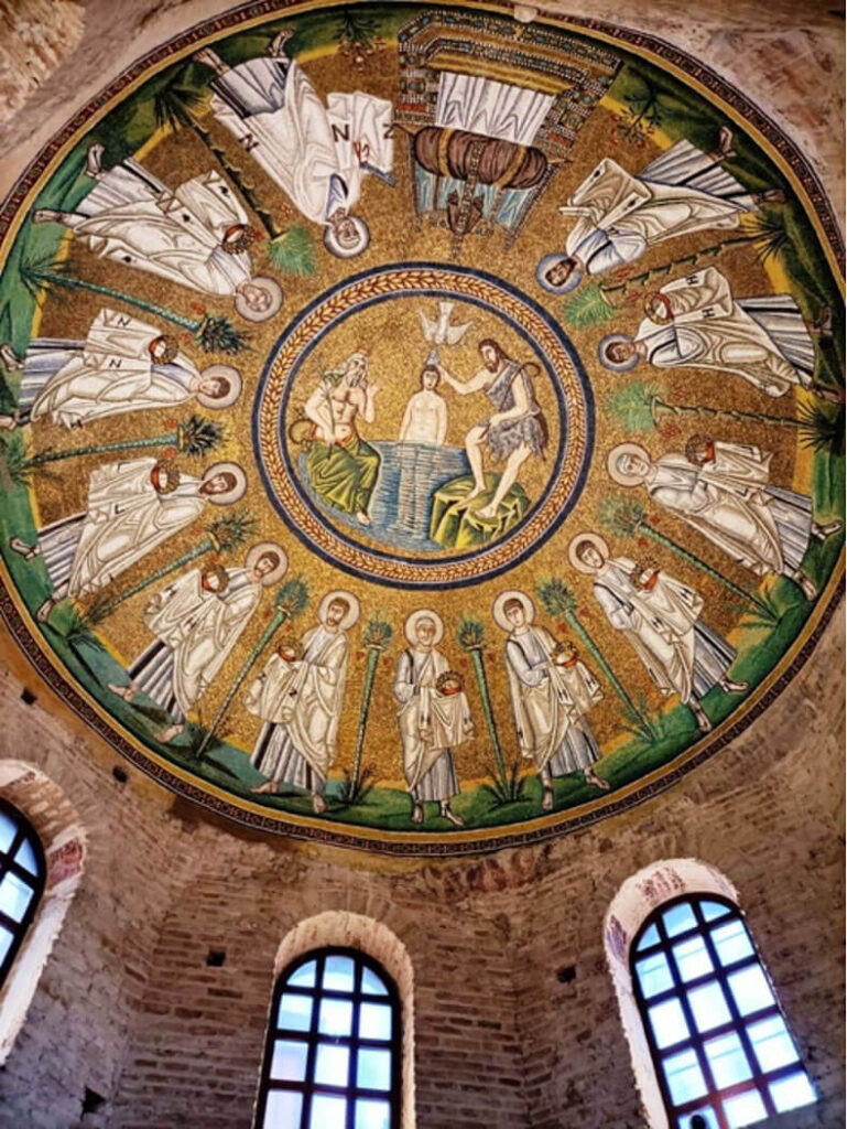 L’interno è spoglio, non fosse per la cupola rivestita di mosaici raffiguranti Il battesimo del Cristo con San Giovanni Battista, la personificazione del fiume Giordano e la colomba dello Spirito Santo. Il cielo è d’oro, ad indicare una luce ultraterrena, come quello di S. Apollinare in Classe.