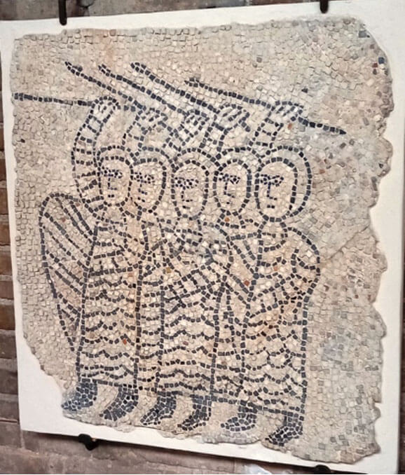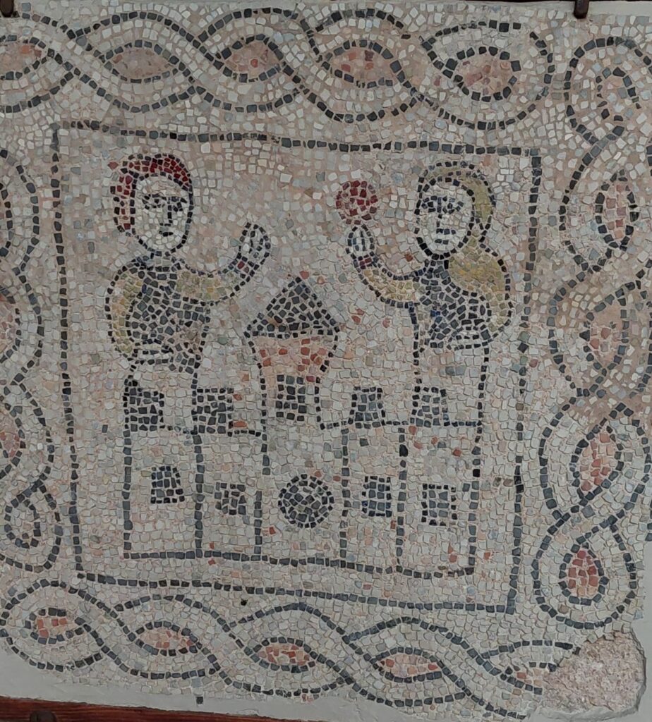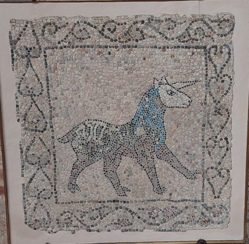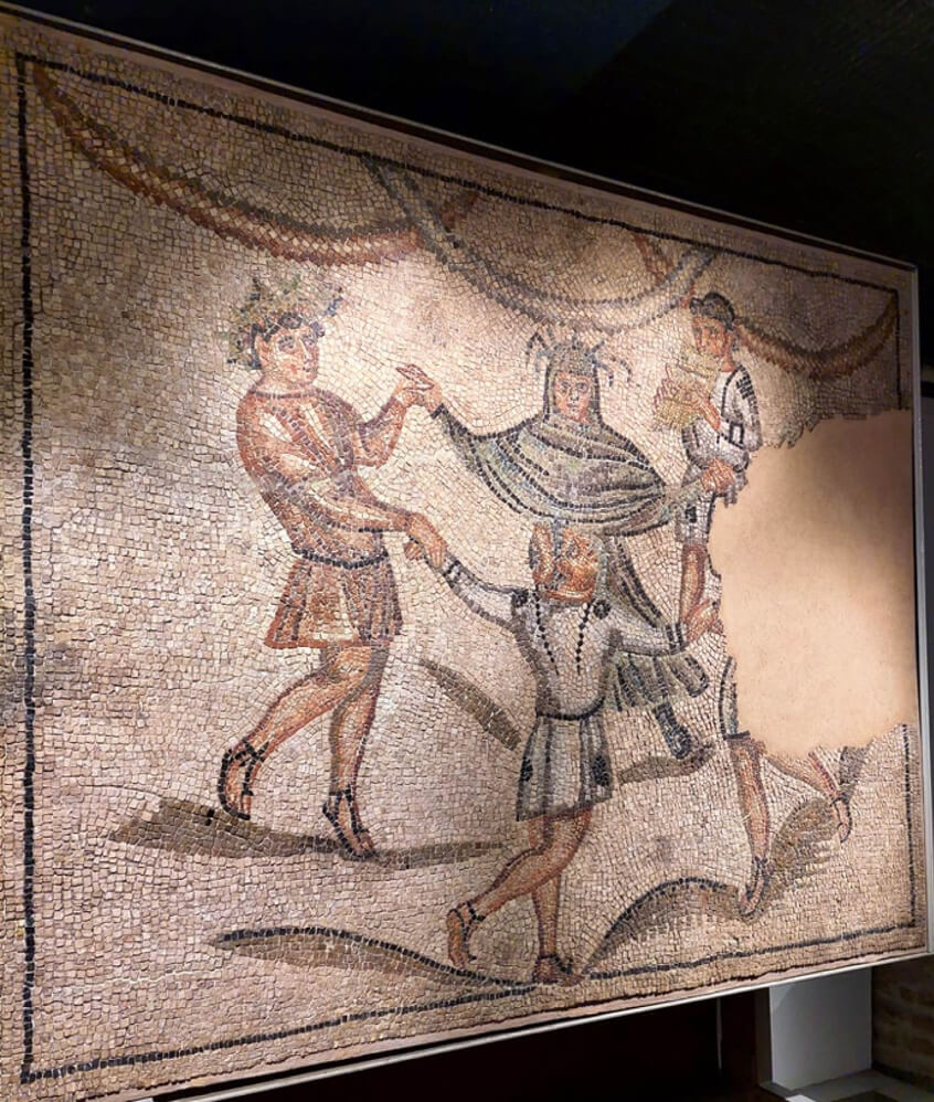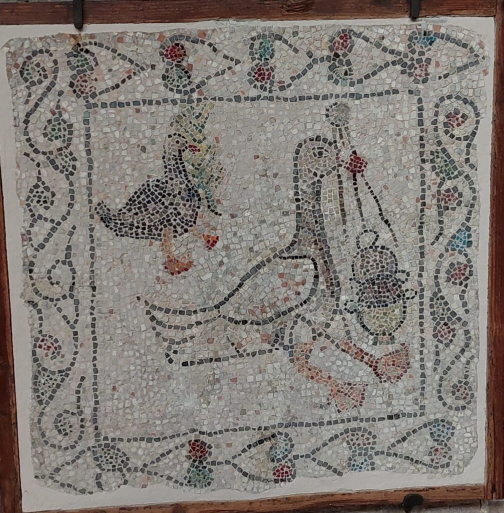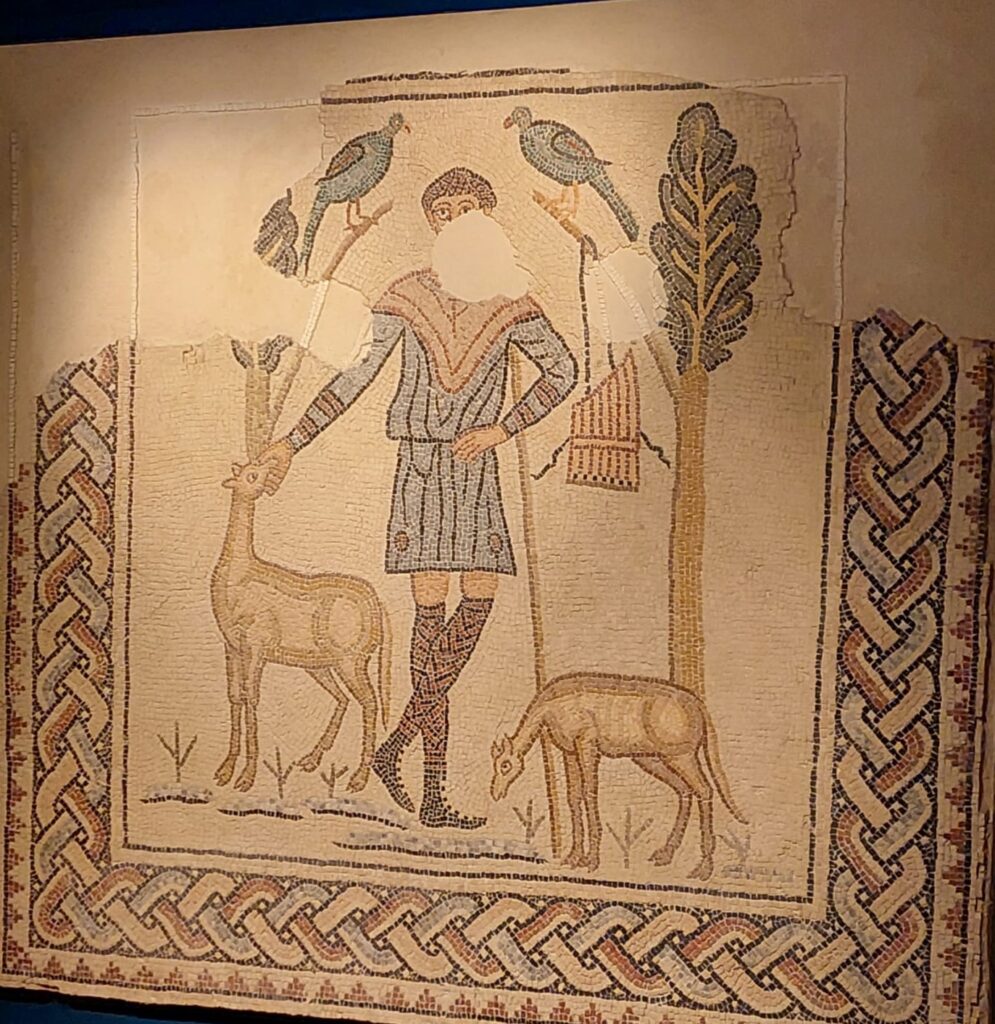 Presso l’ingresso, a destra, c’è il mosaico, staccato e riquadrato, della Danza dei Geni delle Stagioni: quattro figure si prendono per mano e girano in tondo al suono di un raro strumento a fiato, che un quinto personaggio, in tunica bianca, tiene fra le mani. Sul muro opposto, un altro mosaico pavimentale riquadrato è il cosiddetto Buon Pastore; il riferimento cristologico non mi convince: a me sembra un semplice ragazzo fra le pecore. Ma tant’è: spesso si vede ciò che si vuole.