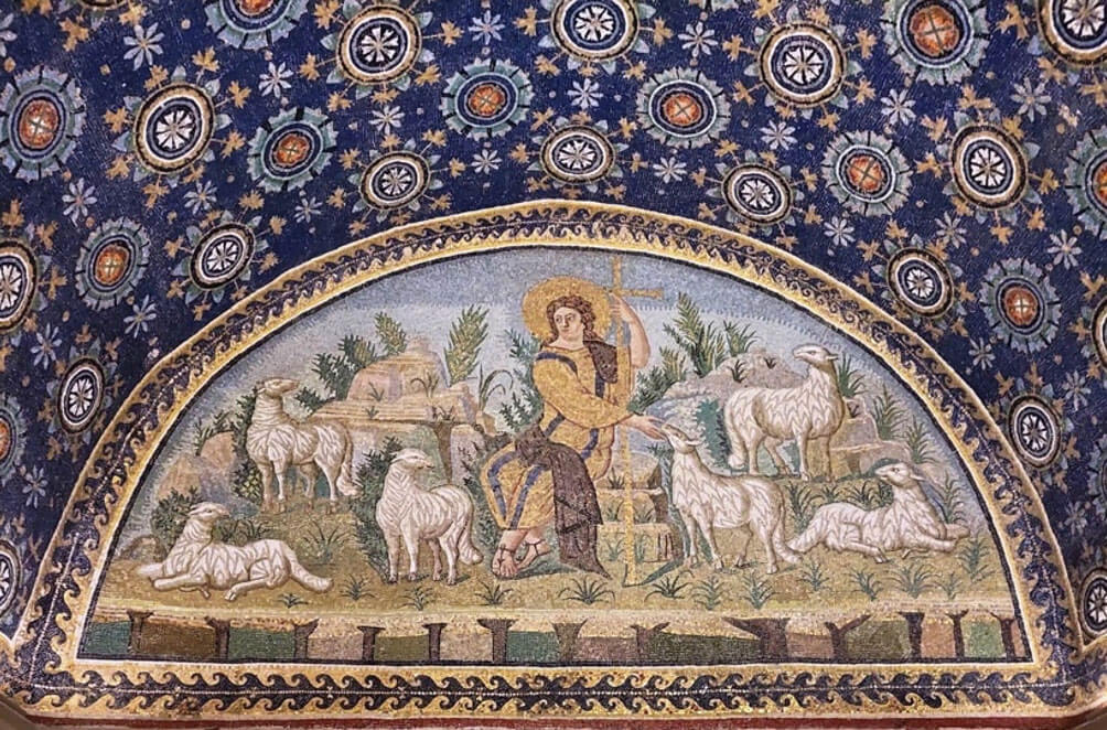 Nell’altra lunetta c’è Gesù, come Buon Pastore (ma con l’abito delle cerimonie di corte), che siede tra alcune pecore. È un Cristo-puer, giovane e sbarbato, ma abbraccia la Croce, simbolo di martirio e salvezza.