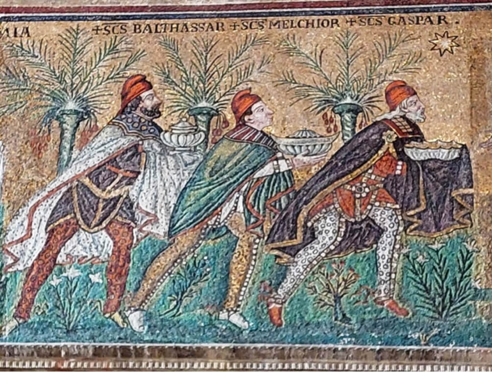 Le due processioni si dirigono l’una verso un Cristo assiso in trono, con il pallio imperiale color porpora e oro, e il nimbo crucisignato; l’altra verso una Vergine Theotókos (Madre di Dio), sempre in Maestà, di fronte alla quale i tre re Magi si inginocchiano nel rituale della proskynesis (prosternazione), tipico delle corti bizantine e normalmente riservato agli imperatori. Mi ha sempre colpito il fatto che questa immagine dei Magi fosse la stessa ricamata sulla veste di Teodora, ma non ho trovato una spiegazione da nessuna parte.
