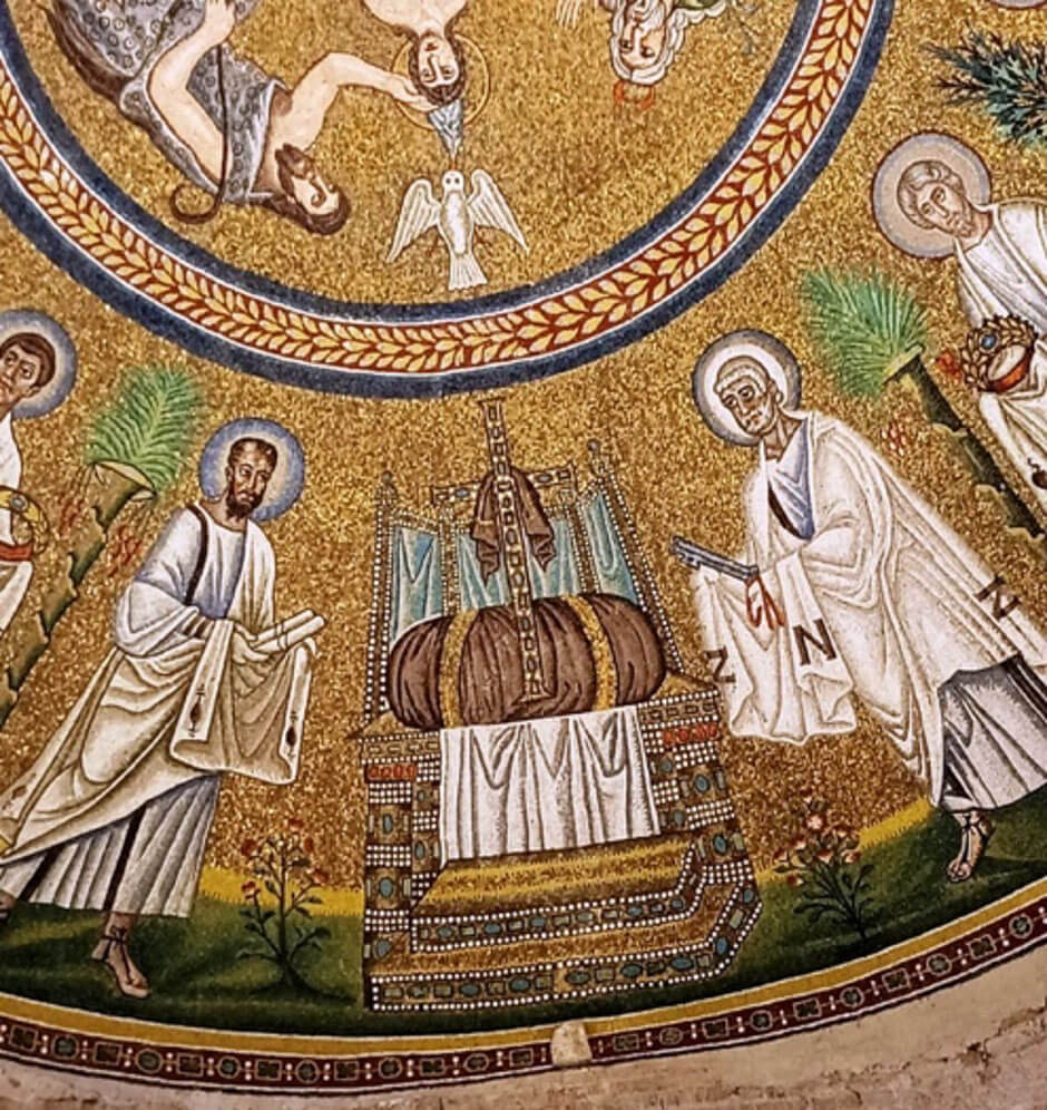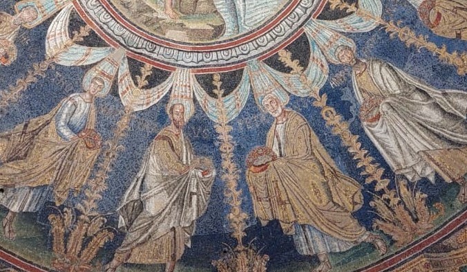 Nella fascia mediana ci sono gli apostoli che, con le mani velate in segno di riguardo e deferenza, recano corone; la corona è simbolo di trionfo, ripresa da quella corona d’alloro che i vinti portavano ai vincitori al tempo dei Romani.