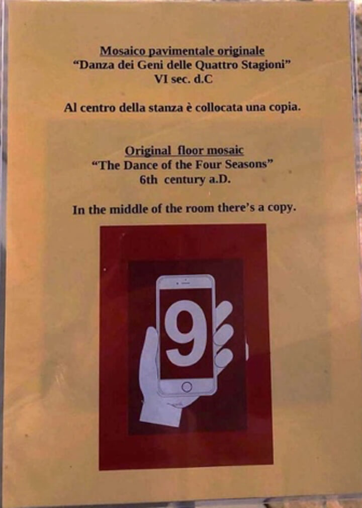 La Elisabetta e la Fiorenza (la Cristina e io siamo rimaste un po’ indietro) stanno cercando di fotografare – in posizioni sempre più arrischiate, sporgendosi oltre il parapetto – il riquadro centrale del tappeto più grande. La Fiorenza invidia Alessandro Gassman per la statura e le braccia lunghe… che arriverebbe come niente direttamente sopra l’immagine, non come lei che rischia di farsi scivolare il cellulare dalle mani… Ci prova la Betta (che è più alta di qualche centimetro – ma non ci sono discendenti dei Normanni, qui!). La quale Betta mi dice: “Questo è il mosaico originale delle stagioni! È anche più bello! Quell’altro lo avranno fatto gli allievi della scuola di mosaico!”.