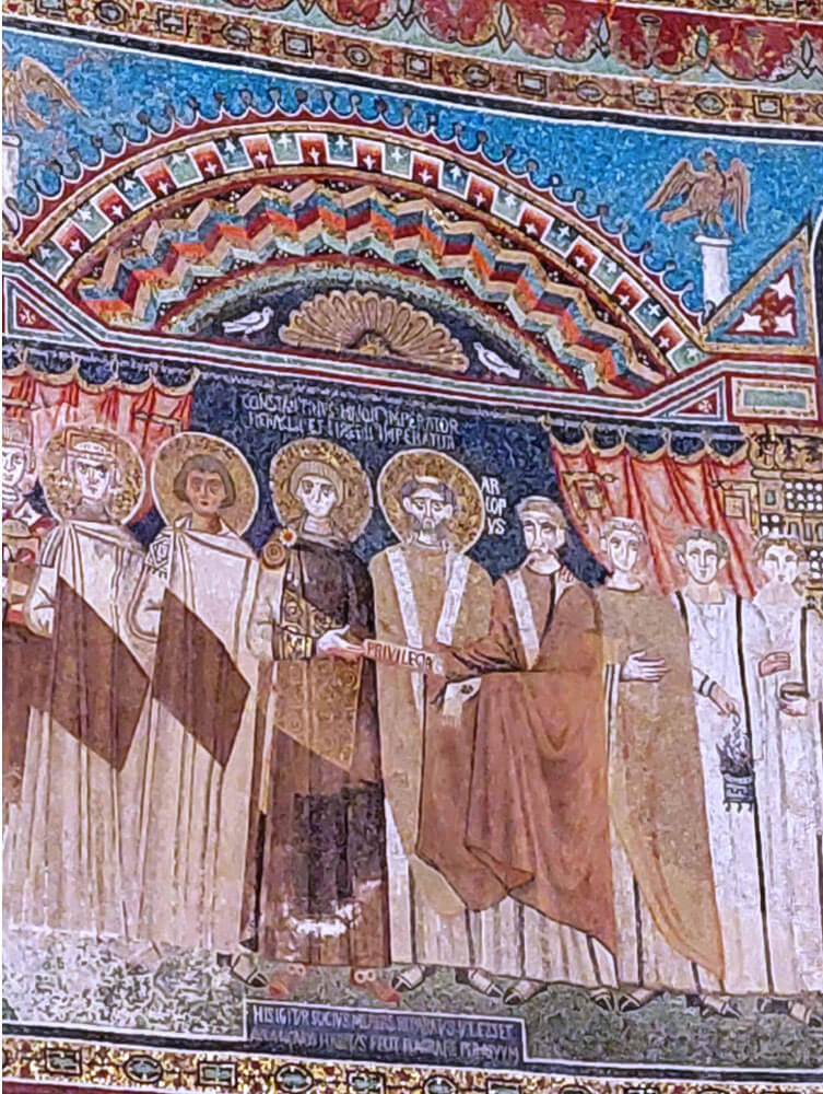 Sant’Apollinare in Classe, nell’Altomedioevo, diventò il luogo della storia della Chiesa ravennate e dei suoi vescovi. C’è qui il mosaico – purtroppo assai rovinato – con la consegna dei privilegia (la concessione dell’immunità dai tributi), dove viene “riusato” il tipo di rappresentazione dei due poteri (politico e religioso) che si trova a S. Vitale: là Giustiniano e Massimiano più di cent’anni prima; qui, intorno al 675, Costantino IV Pogonato, affiancato dai fratelli, e il vescovo Reparato, il quale riceve un rotulo dall’imperatore.
