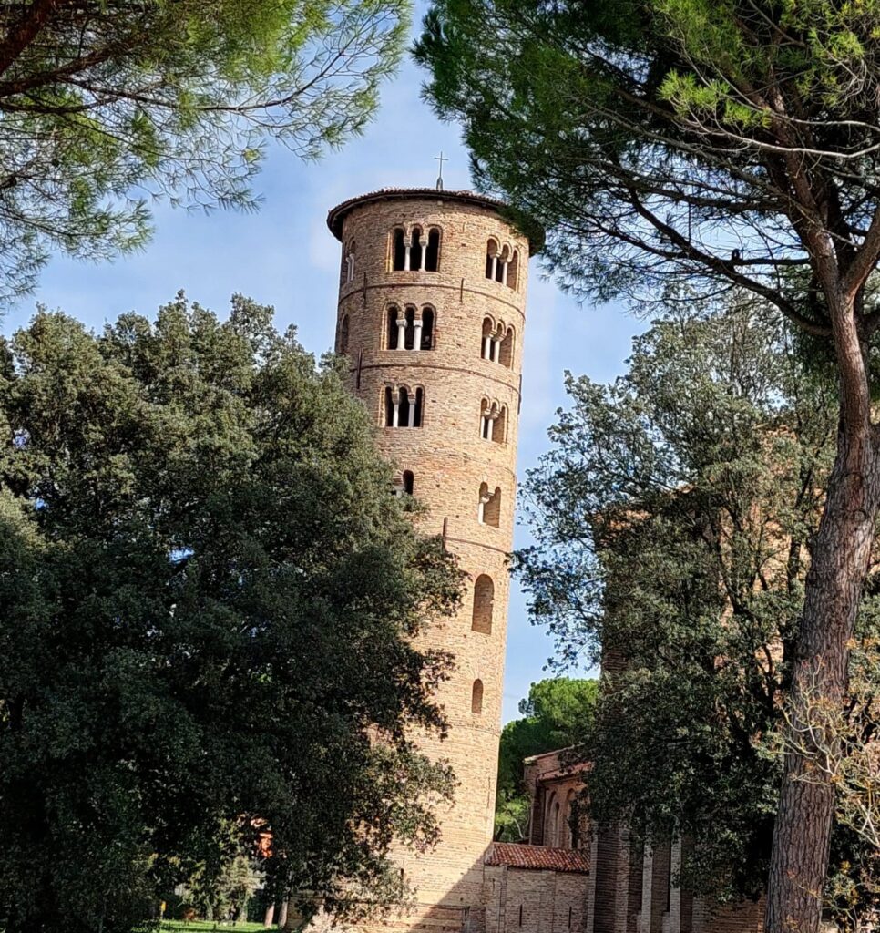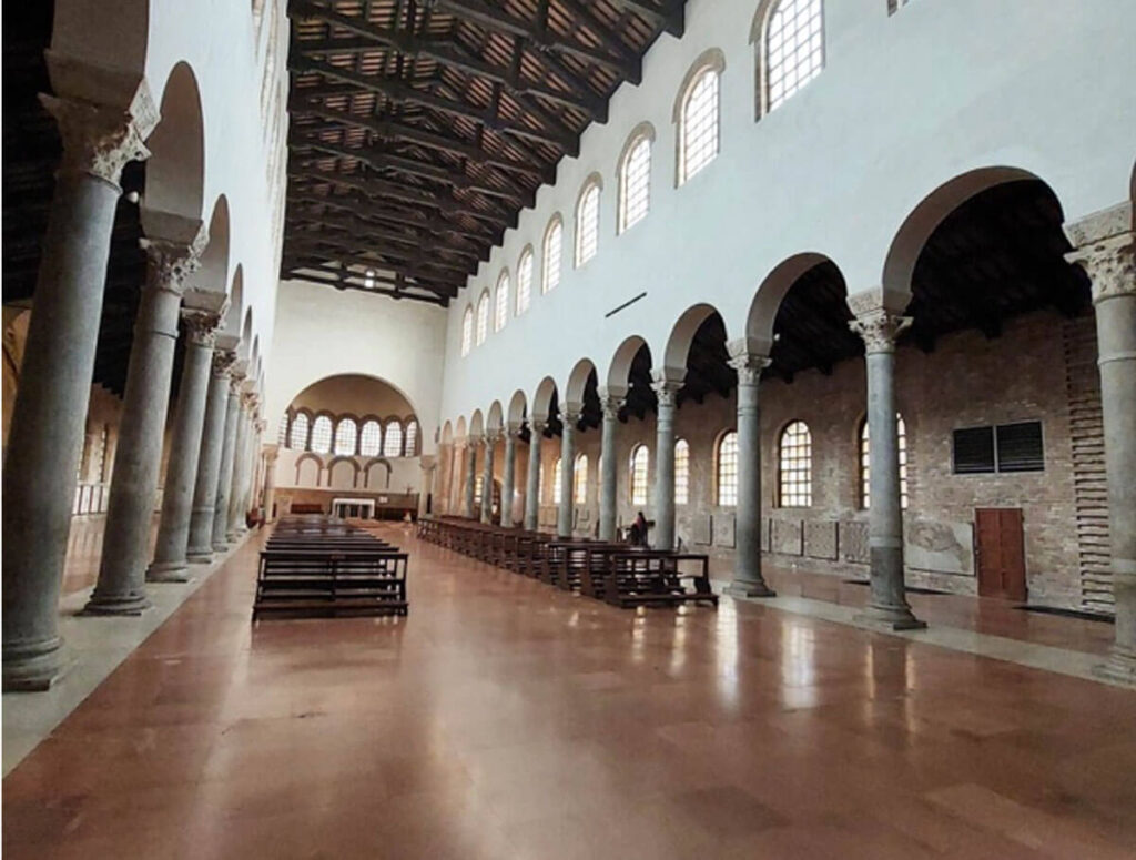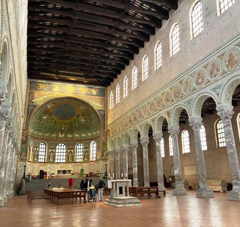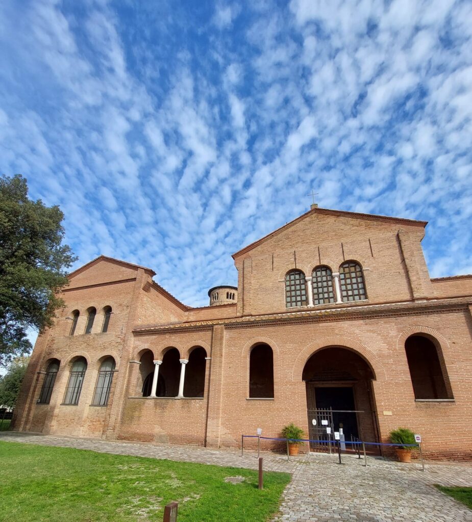 La grande basilica era nata per accogliere le spoglie di Apollinare, primo vescovo e santo patrono della città. È il più grande esempio di basilica paleocristiana: è lunga ben 55.5 metri. Si vedono chiaramente – all’esterno e nell’atrio – i mattoni stretti e lunghi usati anche per S. Vitale. Fu consacrarla nel 549 dal vescovo Massimiano, quello del mosaico di Giustiniano a San Vitale e della cattedra al Museo arcivescovile.