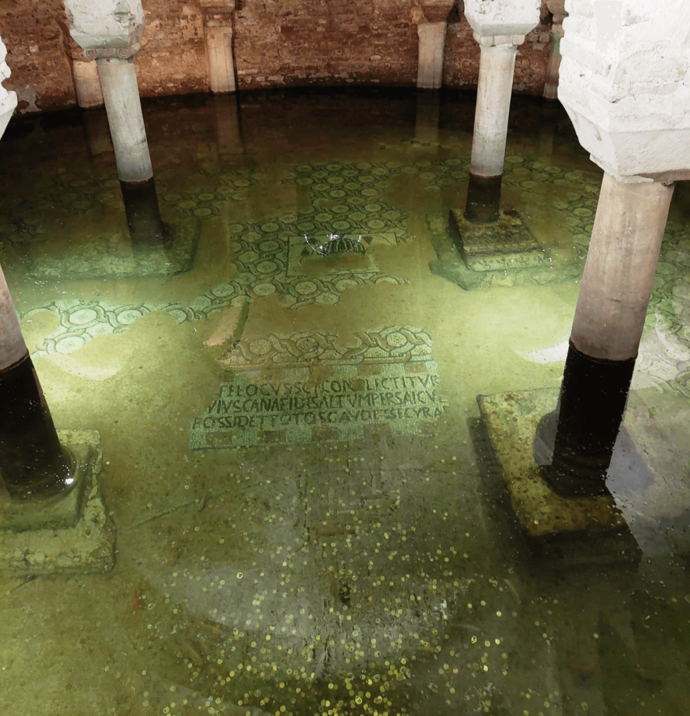 La parte più bella è la cripta – eccola qui! – sommersa dall’acqua e coi pesci rossi. Si può vedere anche dalla chiesa: e io la vedo da lì, mentre le ragazze scendono la stretta scaletta. La cripta conserva l’antichissimo pavimento a mosaico della chiesa primitiva, con due scritte, una in greco (che era la lingua di Galla Placidia) l’altra in latino. L’acqua che la sommerge non è però acqua marina – come dicono diverse guide – ma quella della falda freatica che varia nel livello a seconda delle piogge e del livello del mare. È acqua dolce, filtrata: lo dimostrano i pesciolini rossi che – scrive il libretto – sono “attrazione dei bambini”. Anche della nostra, direi, visto che siamo entrate per quello!