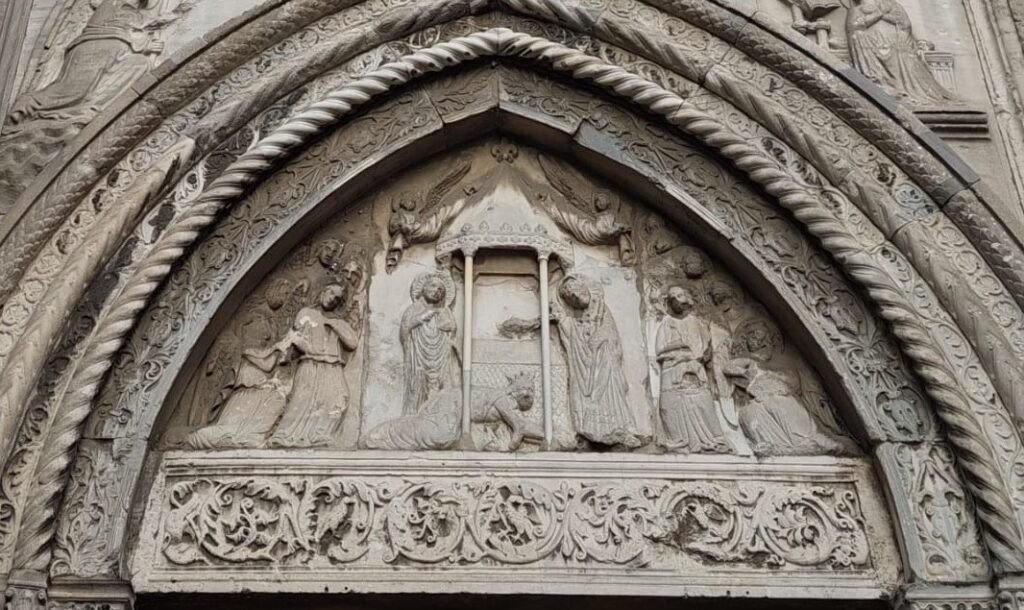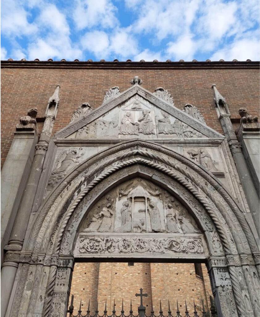 All’uscita, mentre ci vengono chiusi portone e cancello dietro le spalle, ci attardiamo a guardare il bel portale gotico trecentesco, riccamente decorato con bassorilievi: nella lunetta, è raffigurato il cosiddetto Miracolo del Sandalo o l’Apparizione di San Giovanni a Galla Placidia.