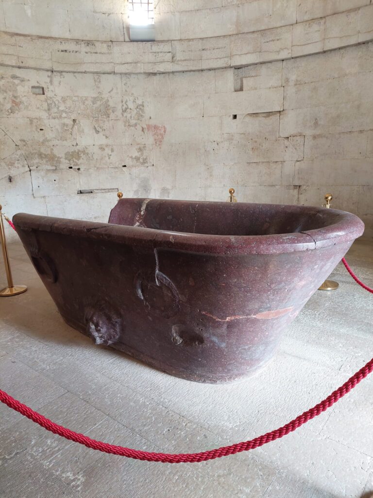Nell’aula superiore c’è la vasca in porfido nella quale, secondo la tradizione, venne posta la salma di Teodorico. Ma la vasca è vuota: le spoglie del re dei Goti furono disperse durante il dominio bizantino; il mausoleo fu trasformato in oratorio e consacrato al culto ortodosso.