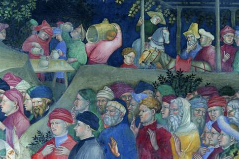 Nella parete destra sono dipinte, in due fasce, le Storie della vita di San Giovanni Battista: la fascia superiore narra la sua vita familiare (e vi prevalgono le figure femminili), quella inferiore la vita pubblica (e vi prevalgono le figure maschili). Al tema religioso sono associati episodi di vita quotidiana, scene di genere e una folla multicolore di personaggi contemporanei.