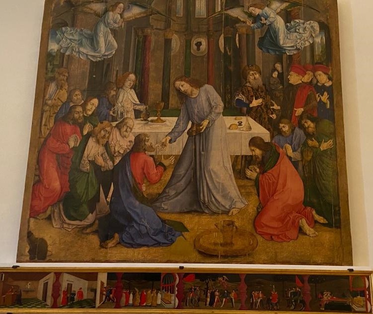 Gesù, seduto a tavola con i dodici Apostoli, volge lo sguardo verso l’alto, con la mano sinistra tiene il pane, mentre la destra è alzata, in atto di benedizione, esattamente sopra al calice di vino; è il momento dell’istituzione dell’Eucaristia. L’artista mostra di nuovo una grande abilità nell’uso della luce, con riflessi luminosi che scivolano sui personaggi e sugli oggetti, determinando bagliori e un raffinato cangiantismo.