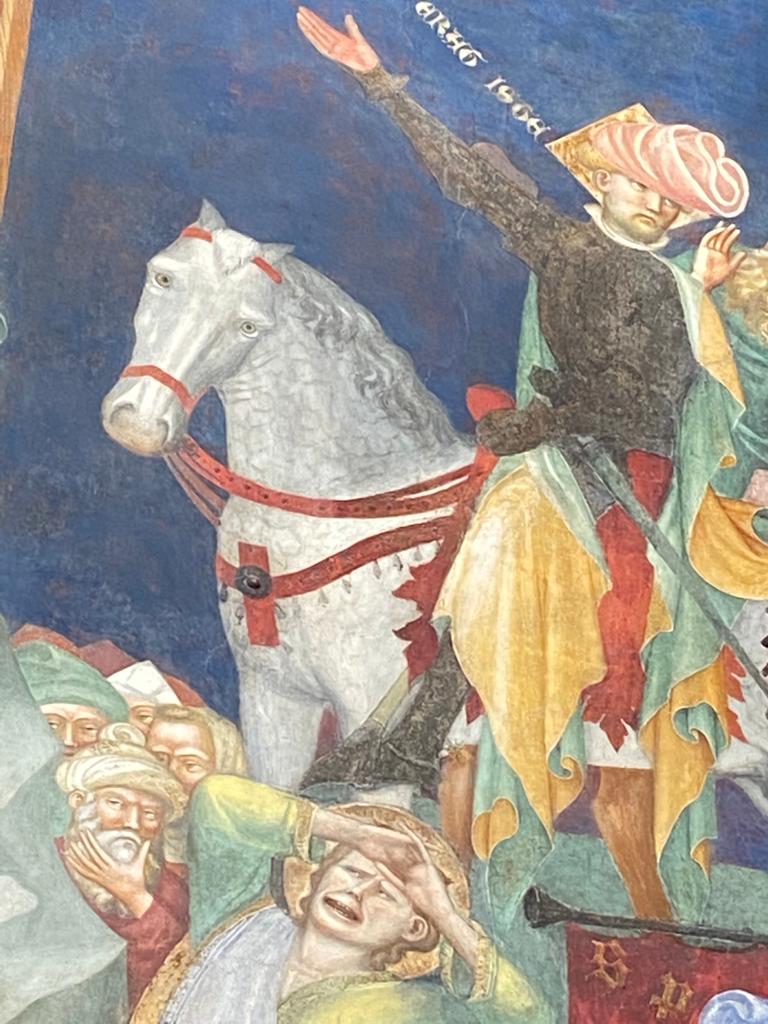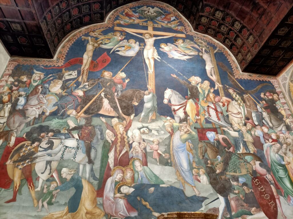 Nella parete dietro l’altar maggiore, campeggia la strepitosa Crocifissione; ricca di dettagli (il dolore gridato della Maddalena, dai capelli biondi e dalla veste rossa; il diavolo che incombe sul ladrone cattivo; i cavalli che a volte ci guardano con sguardi tristi; i soldati intenti al gioco; Longino col vistoso copricapo alla fiorentina, ecc.).