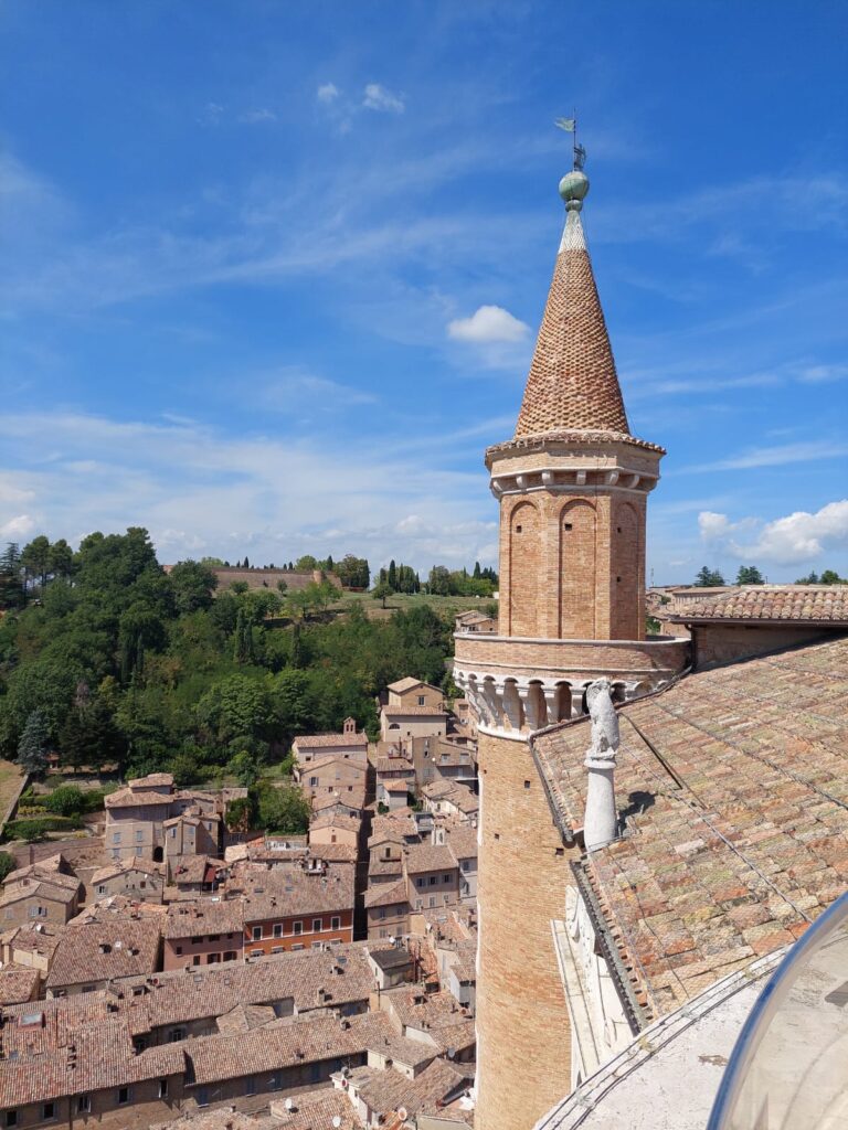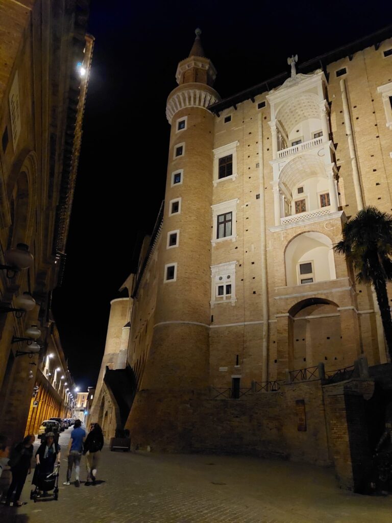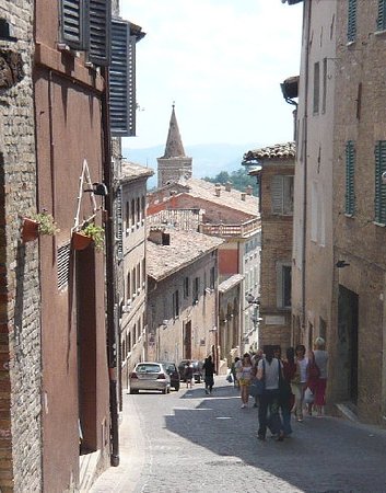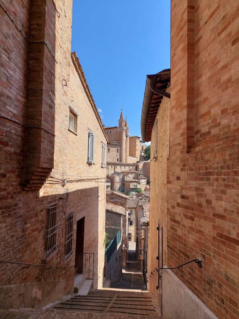 Urbino, in più, sorge su due colli; l’unica parte in piano sono corso Garibaldi e piazza Mazzini. Là in fondo, in alto, i torricini – onnipresenti e bellissimi.