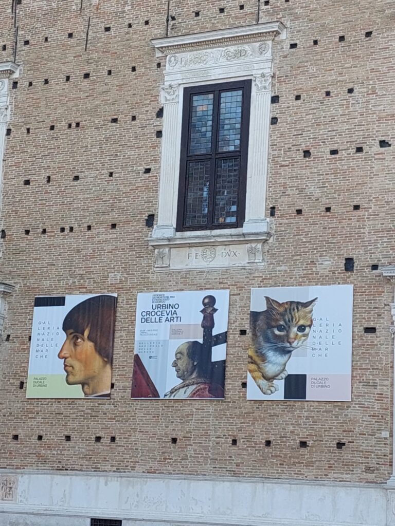 Chiedo a interlocutori immaginari: secondo voi, per quale ragione è stata scattata la foto qui di lato? Per Federico da Montefeltro? Per la pubblicità della mostra? Per la finestra del palazzo, con quelle candelabre di marmo bianco? No no no. Per il gatto! (che, fra parentesi, è proprio ben ritratto).