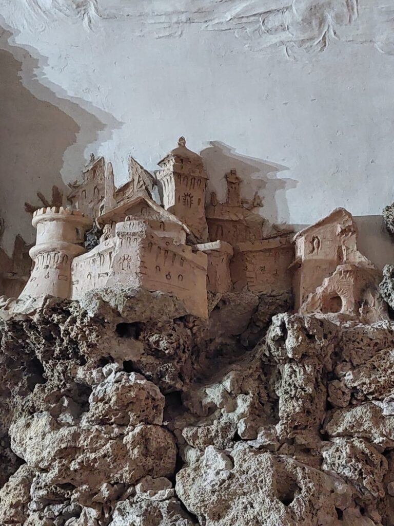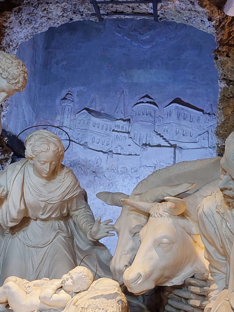 Invece, il presepe di Federico Brandani è bello bello nella sua grotta di tufo e pietra pomice. Nel soffitto, gli stucchi disegnano una movimentata gloria angelica, mentre sul fondo c’è la Natività: Gesù bambino sulla paglia, la Madonna in adorazione, san Giuseppe con l’asino e il bue, e quattro pastori. Il tutto a grandezza naturale. Tutte le figure – e soprattutto gli animali – sono dolcissime. Nello sfondo e sulle pareti, basso e altorilievi coi castelli del ducato.