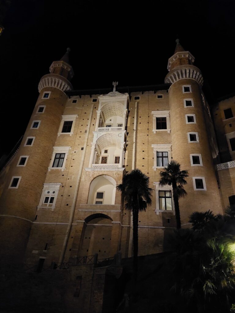 Guardiamo Palazzo Ducale dall’esterno: un’armonia strepitosa, con quella pietra rosa e i ricami bianchi dei portali e delle finestre.