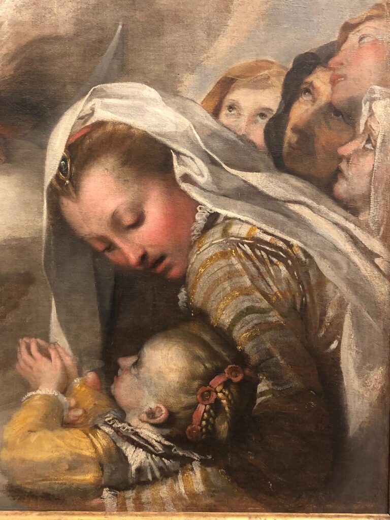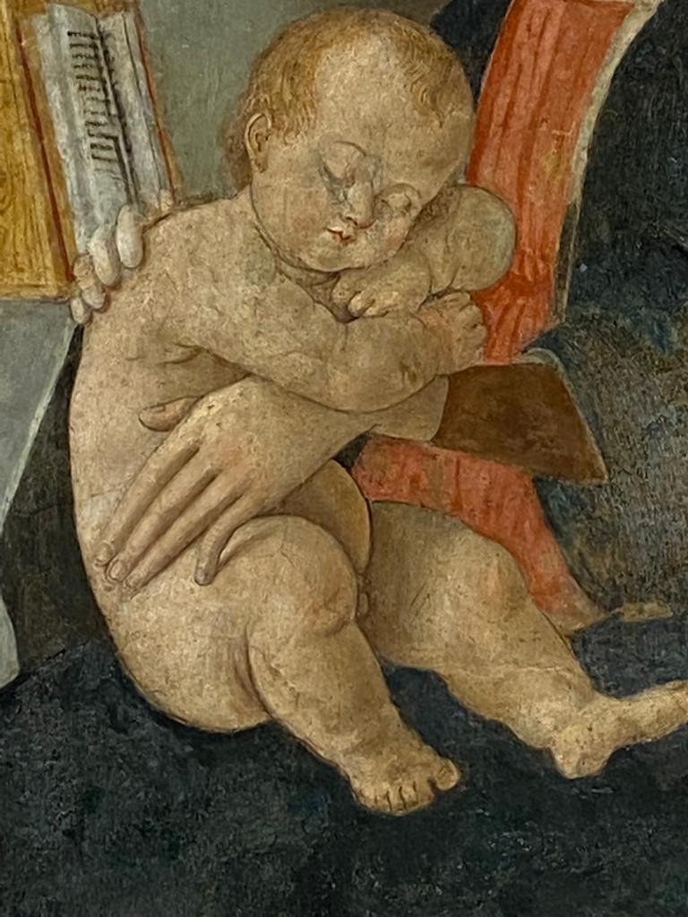 Questo particolare del bambino fu rubato nel 1982, ritagliandolo dalla tela. Del frammento si persero le tracce fino al 2017, quando comparve nel catalogo d’una casa d’aste. I Carabinieri dei Nuclei Tutela Patrimonio Culturale (siano benedetti!) intervennero e sequestrarono il frammento; che fu restaurato e reintegrato nel quadro.