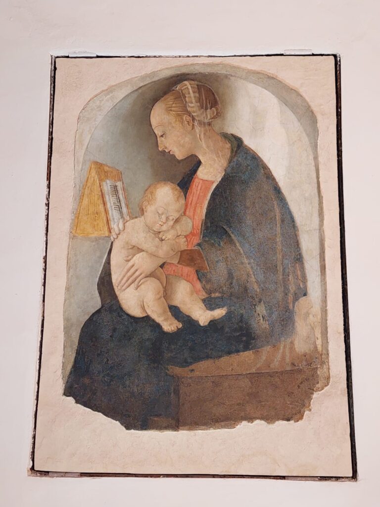 Bellissima e armoniosa, inconfondibile opera di Piero. La Madonna è statuaria, il bambino un piccolo adulto, la luce penetra dai vetri a rondelle della finestra e lumeggia il pulviscolo, la piccola natura morta della cesta di panni. Tutto parla il linguaggio di Piero. Anche gli angeli, per me così inquietanti!