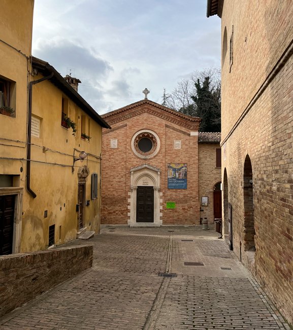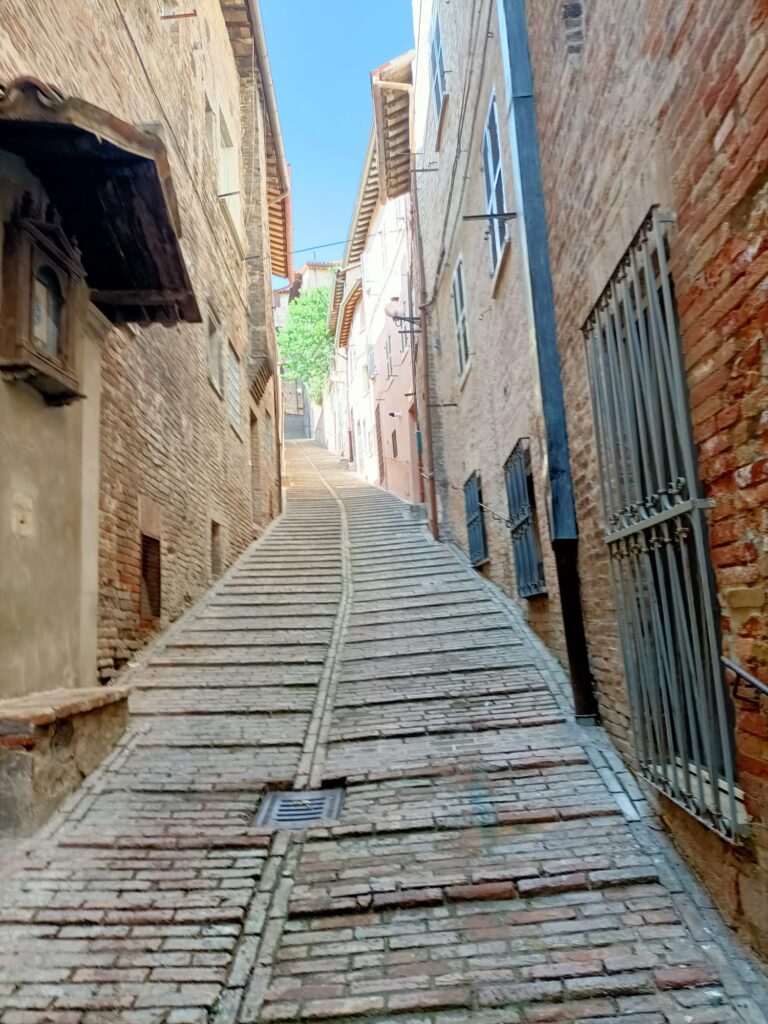 Accanto all’Oratorio, c’è questa discesa. Mi viene una sincope solo a guardarla. La città è pressoché tutta così – come tutte le città appenniniche del resto.