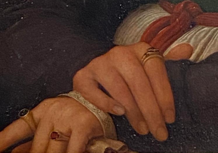 Se ci si avvicinava al quadro, per guardare meglio, partiva una baraonda di sirene… La Fiorenza, saggia, ha fotografato le mani perché vedessimo bene gli anelli (ognuno ha un significato diverso).