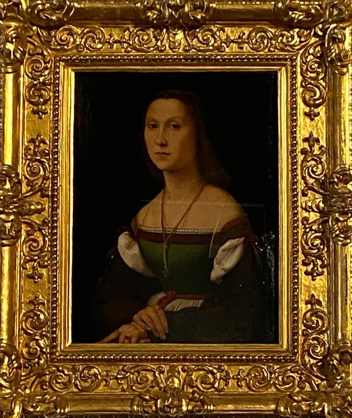 È il ritratto di Maria della Rovere Varano, figlia di Giovanna Feltria, figlia di Federico. Vedova di Venanzio Varano – fatto trucidare da Cesare Borgia – veste l’abito verde da lutto, ha i capelli raccolti in una reticella nera, nella camicia ha ricami neri. Purtroppo, un cattivo restauro, ha alterato alcuni particolari. Ma il fascino del dipinto resta, soprattutto, nell’espressione indecifrabile della donna.
