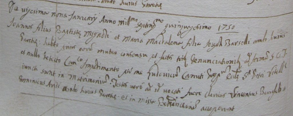 MATRIMONIO di Giovanni e di Maria Maddalena Barselli, 29 gennaio 1750 (S. Pietro di Viadana, Archivio parrocchiale)