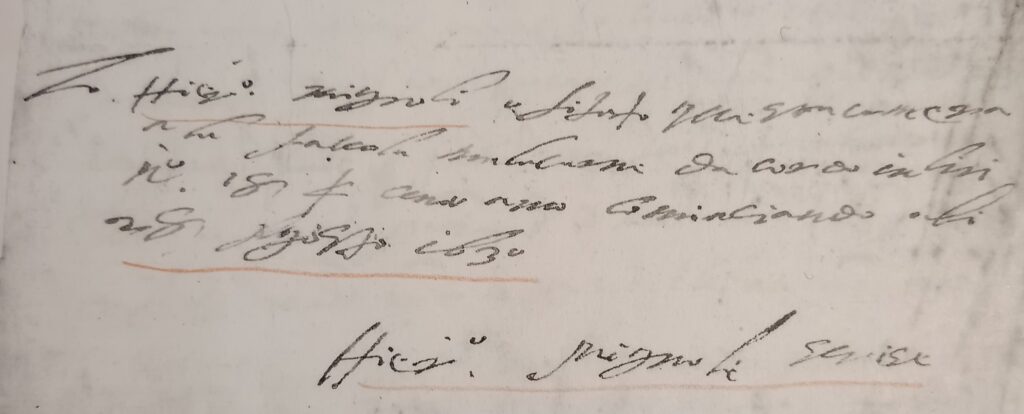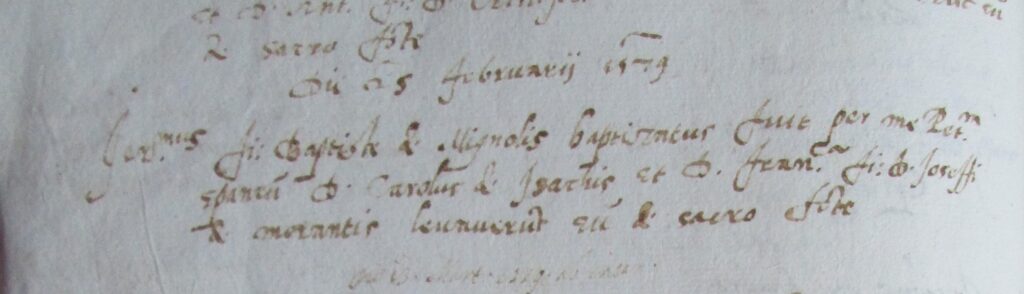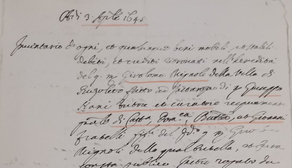 A questa riunione, importante poiché si trattavano i problemi economici relativi alla fondazione di una nuova parrocchia (non solo la costruzione della chiesa, ma anche i vari benefici di cui dotarla) partecipano i capifamiglia di alcune fra le principali famiglie del paese. La firma di Girolamo è ben distinta – anche lontana visivamente –  da quella dello zio Francesco. Se i capofamiglia dei Grazzi, ad esempio, sono ben cinque e i Malacarne quattro, i Mignoli sono due, rappresentanti di due diverse famiglie.