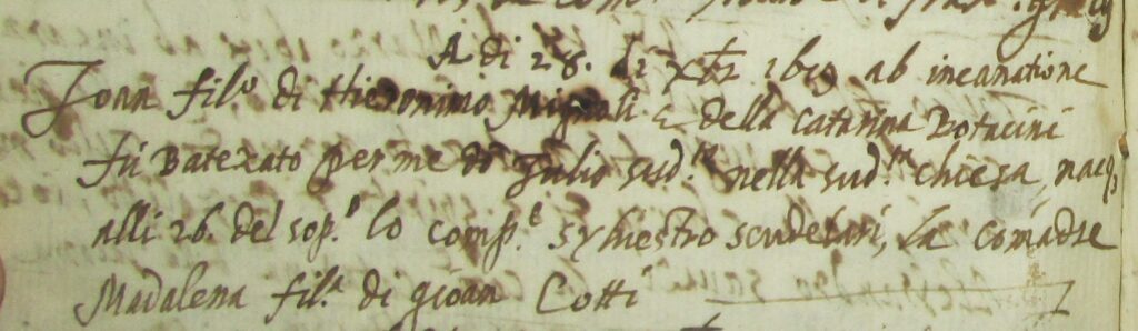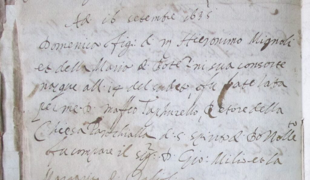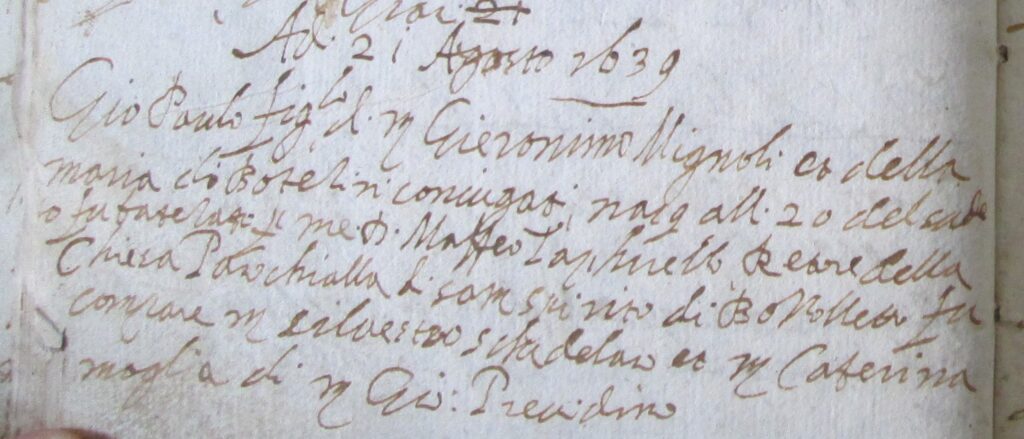 • Paolo, registrato a S. Pietro, nato l’8 dicembre 1608 e morto assai presto, comunque prima del 1612 (nella parrocchia di San Pietro mancano per il periodo i registri dei defunti);