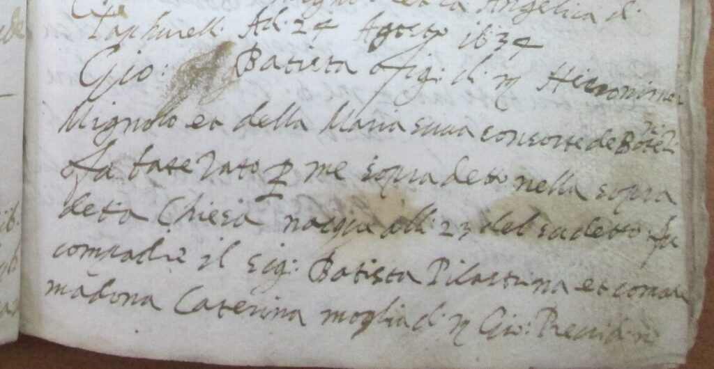 Battesimo di Girolamo figlio di Battista Mignoli (Viadana, chiesa di San Pietro, Archivio parrocchiale)